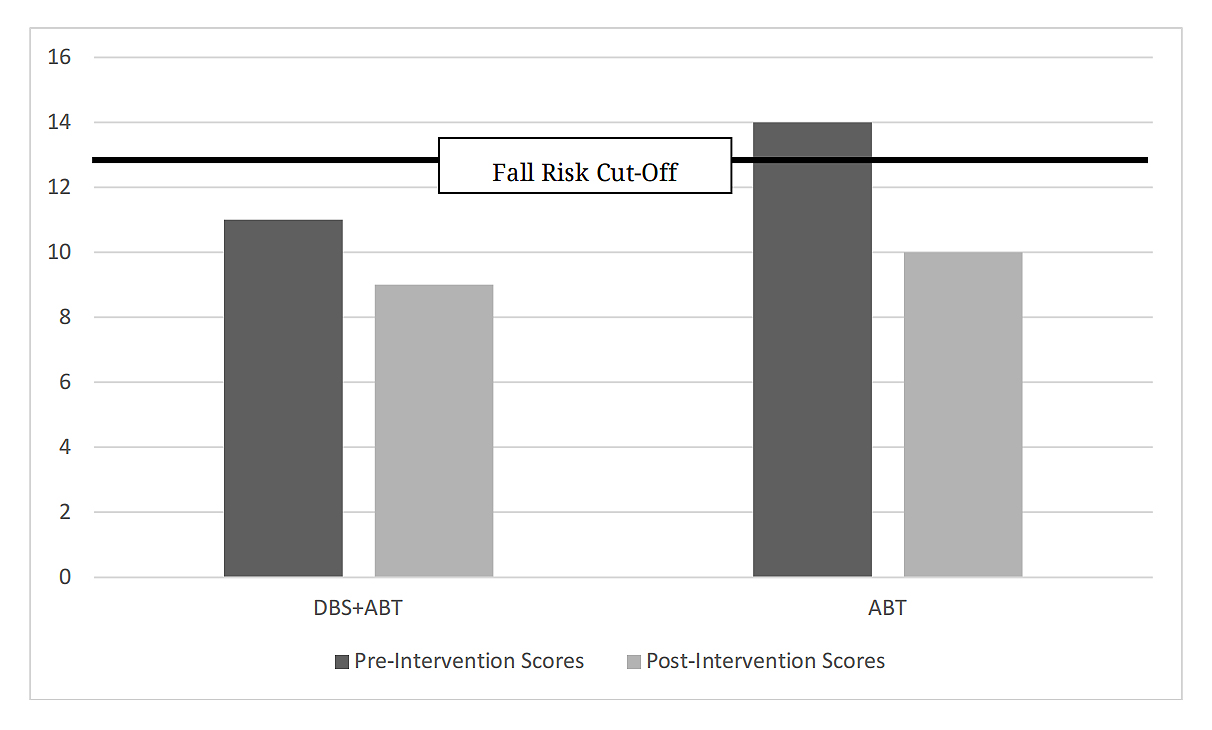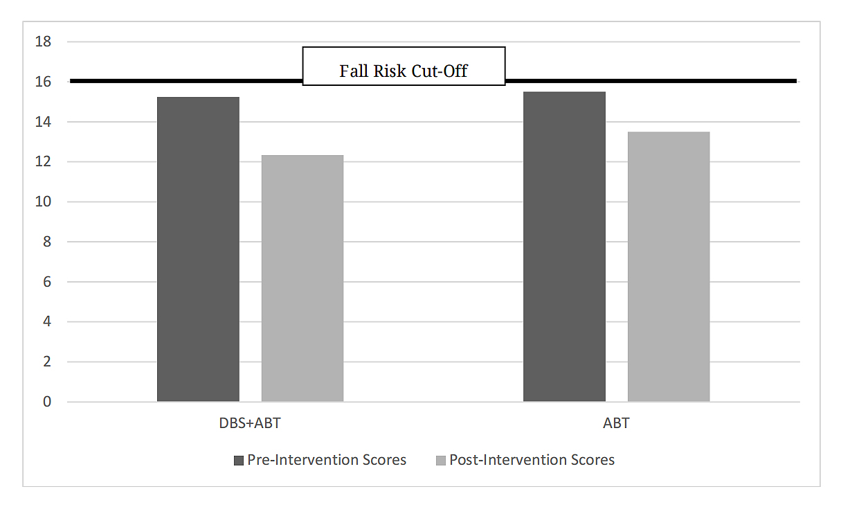 The results of the descriptive statistics showed that the DBS+ABT group had lower values for the TUG time difference before and after intervention (M = 1.17, SD = 1.59) than the DBS group (M = 4.14, SD = 3.58). The results of the descriptive statistics also showed that the post interventions TUG time for the DBS+ABT group (M = 8.93, SD = 1.98) and the ABT group (M = 9.86, SD = 6.41) make the cut off score of 20.0 seconds to be classified as independent for basic transfers, and cut-off score of 11.5 seconds to be classified as decreased fall risk based on mobility after the ABT intervention (Figure 3) [26].