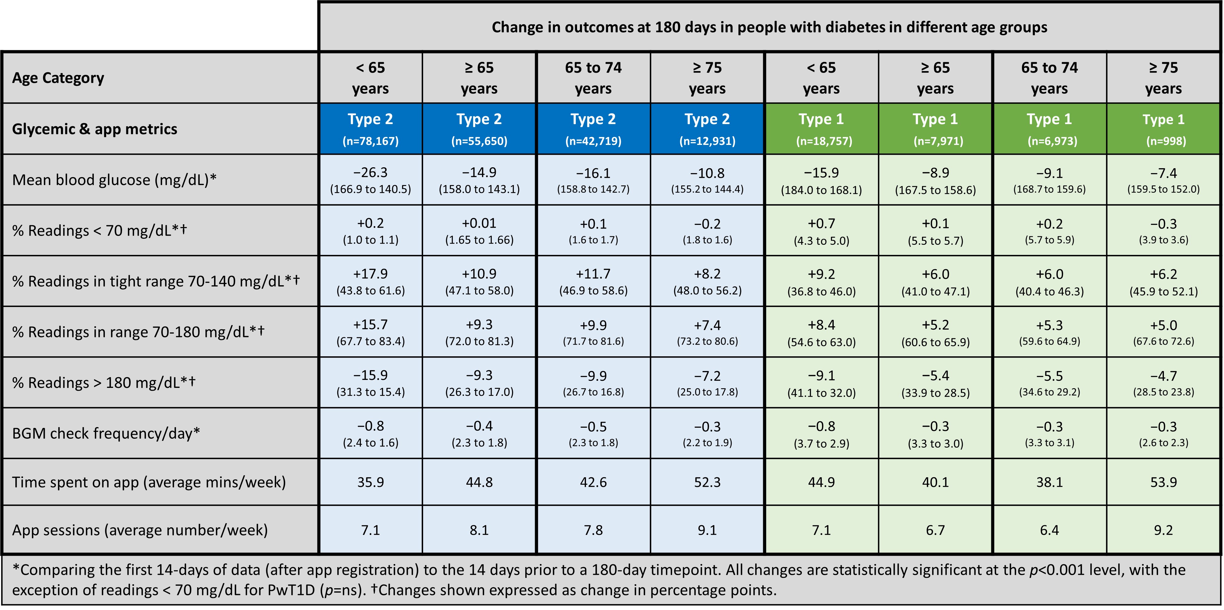 Methods: Anonymized glucose and app analytics from 160,545 PWDs, including 63,621 PWDs ≥65 years, were extracted from our server. Data from their first 14 days using the OTR app was compared with 14 days prior to a 180-day timepoint using paired within-subject differences.