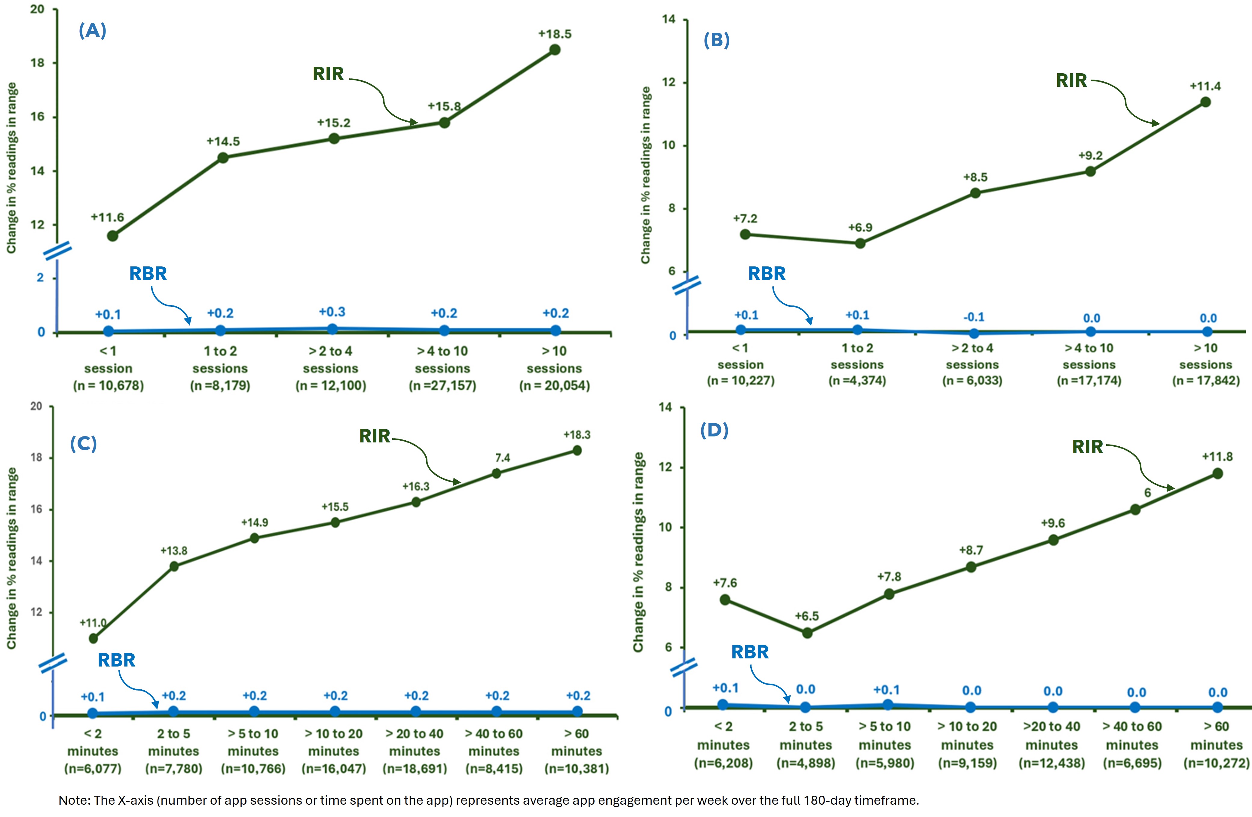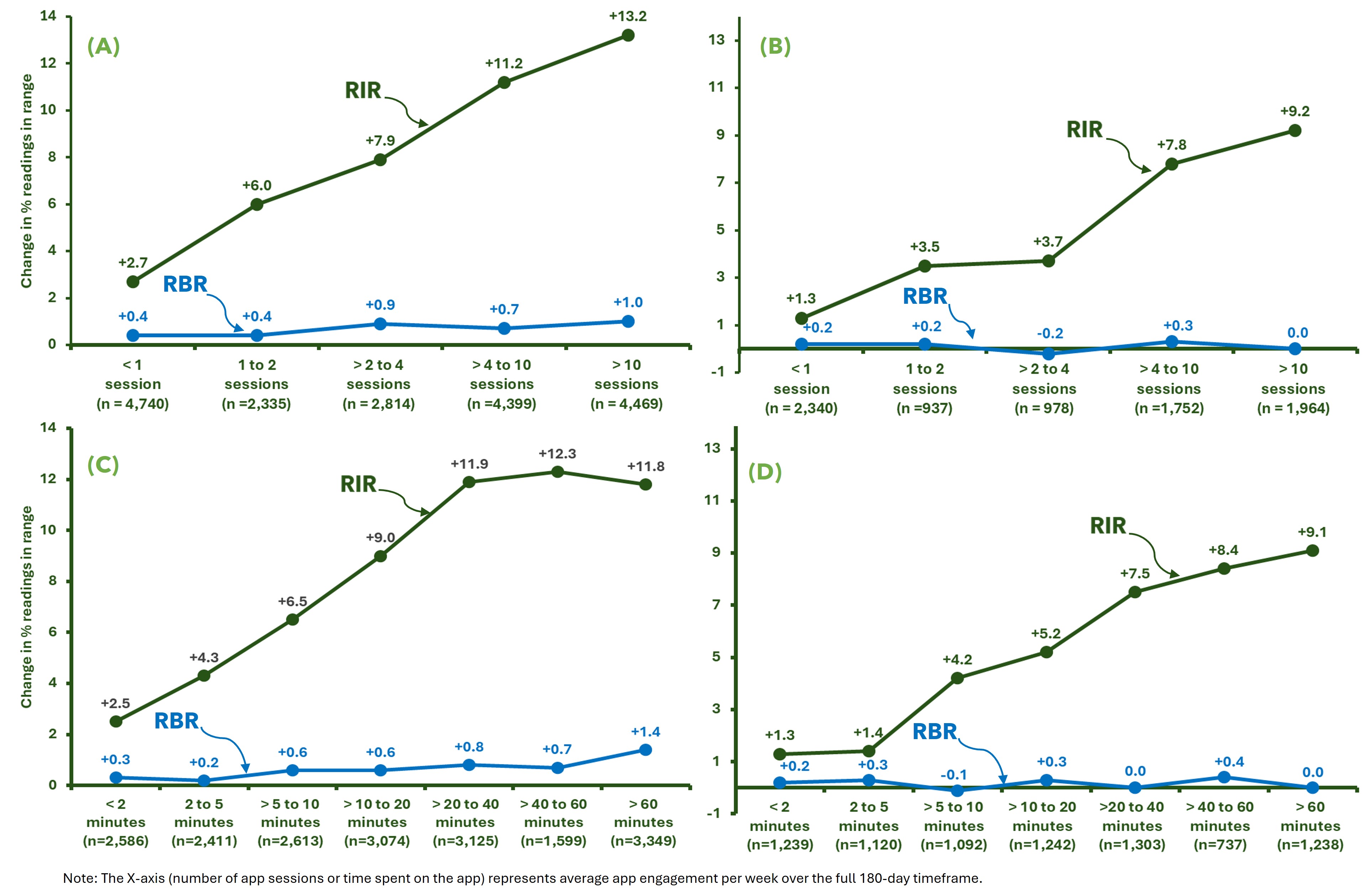 For each subject, the mean BG and percentage of readings within various glycemic ranges [hypoglycemic (<70mg/dL), readings in tight range (RITR, 70–140mg/dL), readings in range (RIR, 70–180mg/dL) and hyperglycemic (>180mg/dL)] were calculated for the first and last 14 days. Within-subject differences from baseline were then averaged across all subjects. App analytics were used to evaluate the influence of app engagement on glycemic outcomes. For each subject, the number of sessions and time spent in the app per week were averaged over the full 180 days. Categories of app usage were created based on the spread of the app engagement data over this timeframe; sessions per week were: <1, 1 to 2, >2 to 4, >4 to 10 and >10, and minutes per week on the app were: <2, 2 to 5, >5 to 10, >10 to 20, >20 to 40, >40 to 60 and >60. All statistical comparisons between baseline and the 180-day timeframe were performed using two-sample t-tests with SPSS Version 26.