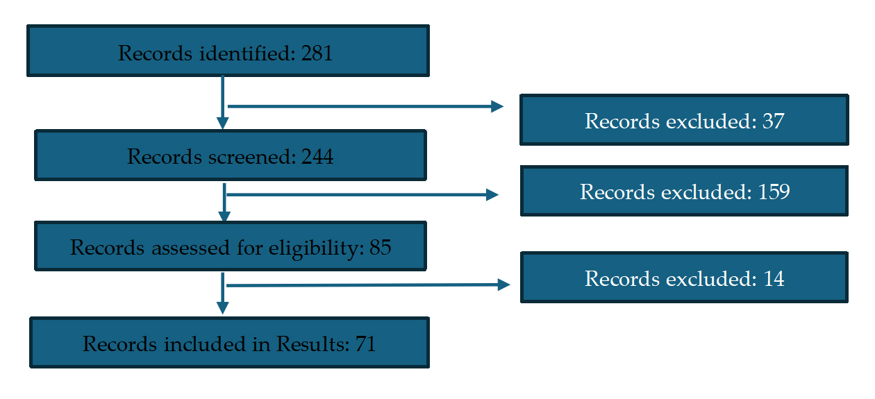 To find out the main existing literature regarding genetic, molecular, biological, electrophysiological, and neuropsychiatric features of AD, PD, and DLB, a literature search was carried out by means of the “PubMed” database. Keywords employed were “neuropsychiatric symptoms”, “Alzheimer Disease”, “Parkinson Disease”, “Lewy Body Dementia”, “therapy”, “overlap”, “diagnostic”, “clinical”. Exclusion criteria were: (1) studies dealing with other than neuropsychiatric aspects of AD, PD, and DLB; (2) studies not carried out in human models; and (3) works not written in English. The literature review was conducted till February 2025. After an initial search, a total of 281 studies were identified. Articles not matching the above-mentioned characteristics were removed (n = 37) and the remaining 244 were considered for inclusion. Among them, 85 were assessed as eligible for inclusion and 71 of them were finally included in the “Results” section of the manuscript (see Figure 1).