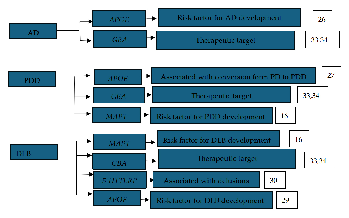 Stimulating evidence of a common genetic basis between PD and AD seems to come from a genome-wide meta-analysis by Real et al. (2023) who identified APOE-4 as a major risk factor both for AD and for the conversion from PD to PDD [26]. Accordingly, a recent study by Wu et al. (2024) confirmed the causative role of APOE-4 for the development of dementia, while SNCA-AS1 and LKKR2 seem to exert a protective role [27]. Regarding SNCB, it has been reported a high prevalence of genotypes associated with low gene expression [28]. In support of this evidence, Guerreiro and colleagues suggested that DLB and PD share lots of genetic determinants, the APOE locus [29]. Another shared genetic polymorphism is 5HTTLPR, a 43-base-pair insertion/deletion in the promoter region of the SLC6A4, with a short and long allele, often associated with delusions in DLB [30]. In this framework, a study carried out in individuals with DLB and PDD found that those with homozygosis for the L/L genotype and a lower Mini Mental State Examination (MMSE) score showed an increased risk for delusions, thus suggesting that the 5HTTLPR polymorphism is associated with delusions in DLB [30]. Accordingly, Quaranta et al. (2009) and Sweet and colleagues reported the L/L genotype to be associated with psychosis in AD and, in turn, suggested that the 5-HTTLPR polymorphism might be a shared risk factor for psychotic symptoms across diseases [31,32]. Other genes implicated in the pathophysiology of AD, PD, and DLB, are glucocerebrosidase gene (GBA) variants, the SNPs, which could be useful target therapeutic interventions [33,34], and the microtubule-associated protein tau gene (MAPT), that may be associated with the risk of DLB and PDD [16]. When analysing DNA methylation patterns among different neuropsychiatric disorders, Fisher et al. (2023) pointed out that DLB and PD differed in the level of methylation in 197 regions with PD being associated with hypomethylation [35]. However, it should be considered that there have been conflicting results on the association between this polymorphism with a variety of neuropsychiatric symptoms and syndromes, also giving the fact that many of these studies are too small [36] (See Figure 2).