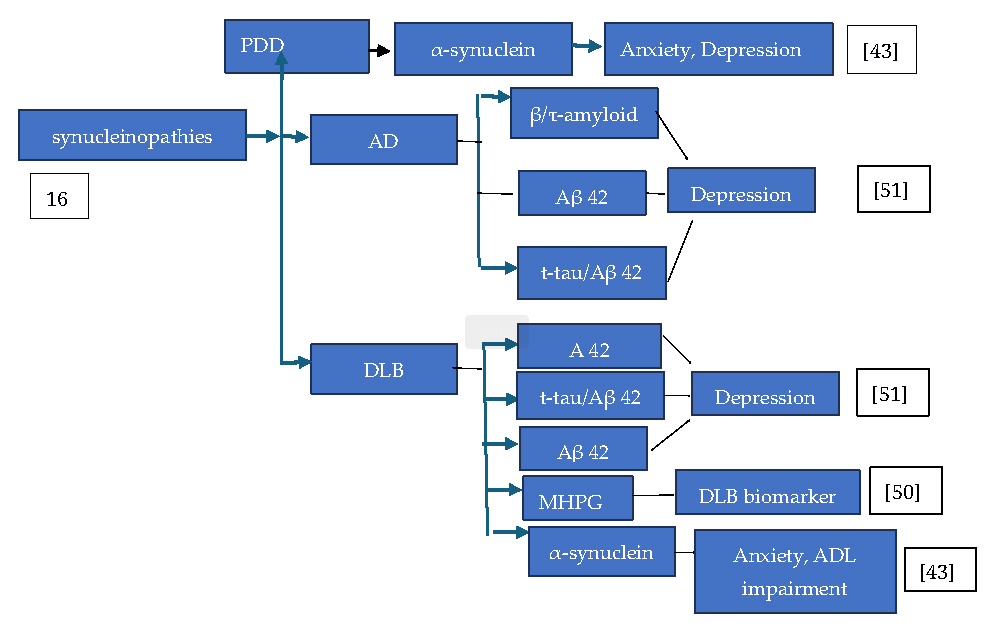 In this framework, also cerebrospinal fluid (CSF) analysis suggests that DLB, AD, and PDD may be differentiated based on different protein levels. In fact, PDD individuals generally show lower CSF amyloid β42 (Aβ 42) levels than those with Parkinson’s disease without dementia [48]. In addition, Aβ 42 CSF levels tend to decrease in DLB from early states to moderate and severe ones [49]. Methoxy-4-hydroxyphenylethyleneglycol (MHPG) CSF levels, together with those of t-tau, p-tau, and A-42 proteins, have been presented as a potential DLB biomarker [50]. Instead, AD is associated with significant levels of CSF T-Tau and pTau181 if compared to DLB and PDD. However, P and Tau levels seem to correlate with disease severity in both AD and DLB, with higher protein levels found in more severe states [49]. Furthermore, it was found an association between CSF-derived biomarkers of Aβ42, t-tau/Aβ42 and depressive symptoms in subjects with both DLB and AD [51].