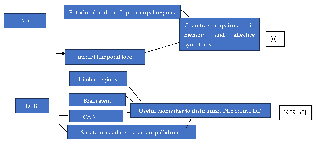 PD and DLB are known as α-synuclein (α-syn) pathologies, while AD is classically associated with amyloid β (Aβ) accumulations [3]. α-syn and Aβ are amyloidogenic proteins that tend to accumulate as insoluble fibrillary deposits in the brain of patients suffering from neurodegenerative diseases, including AD, PD, and DLB [4]. Wakasugi & Hanakawa (2021) proposed that the reciprocal relationship between α-syn and amyloid accumulation, as well as prion-like progression, may explain the overlapping pathology between AD and DLB [5]. The two pathologies also share anatomical aspects, such as the thinning of the entorhinal cortex [6]. In this framework, neuroimaging studies, including positron emission tomography (PET), are sometimes useful to detect similar or different functional aspects between the two diseases [7].