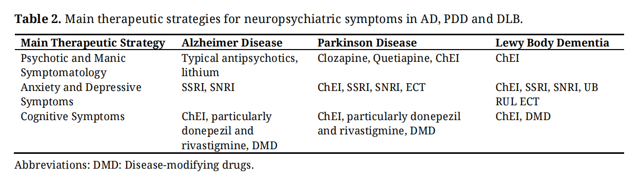 Table 2. Main therapeutic strategies for neuropsychiatric symptoms in AD, PDD and DLB.