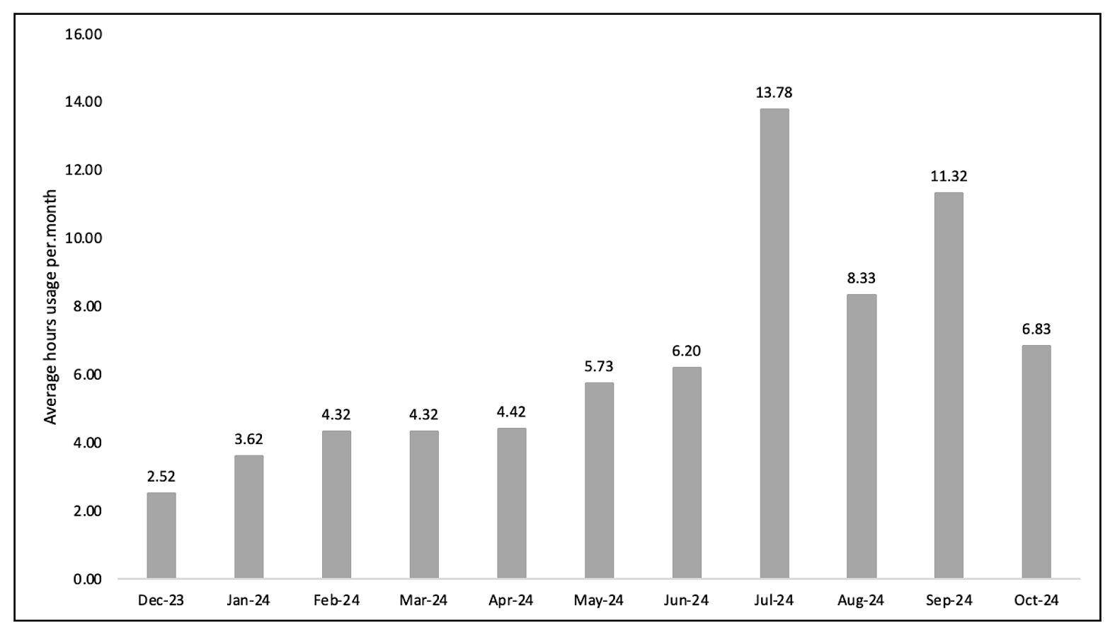 The project commenced in November 2023 with 65 homes taking part and ended in October 2024 with 68 homes participating; a total of 78 homes participated at some point during the project, with 56 taking part the whole of the year. Separate analysis of usage of the platform by danceSing showed that at month one the average hours per month used per home was 2.5 which would equate to 1.9 × 20-minute sessions per week. By month three the platform was sufficiently used on average equating to the prescribed three sessions per week and in month eight usage was 13.7 h per month per home equating to about 10.2 sessions per week. Part-way through the project, the Scottish Government Team suggested that homes be asked to use the program for at least five hours per month; this was achieved across all homes by month eight and was maintained until the end of the project. Average engagement hours across homes are shown in Figure 1.