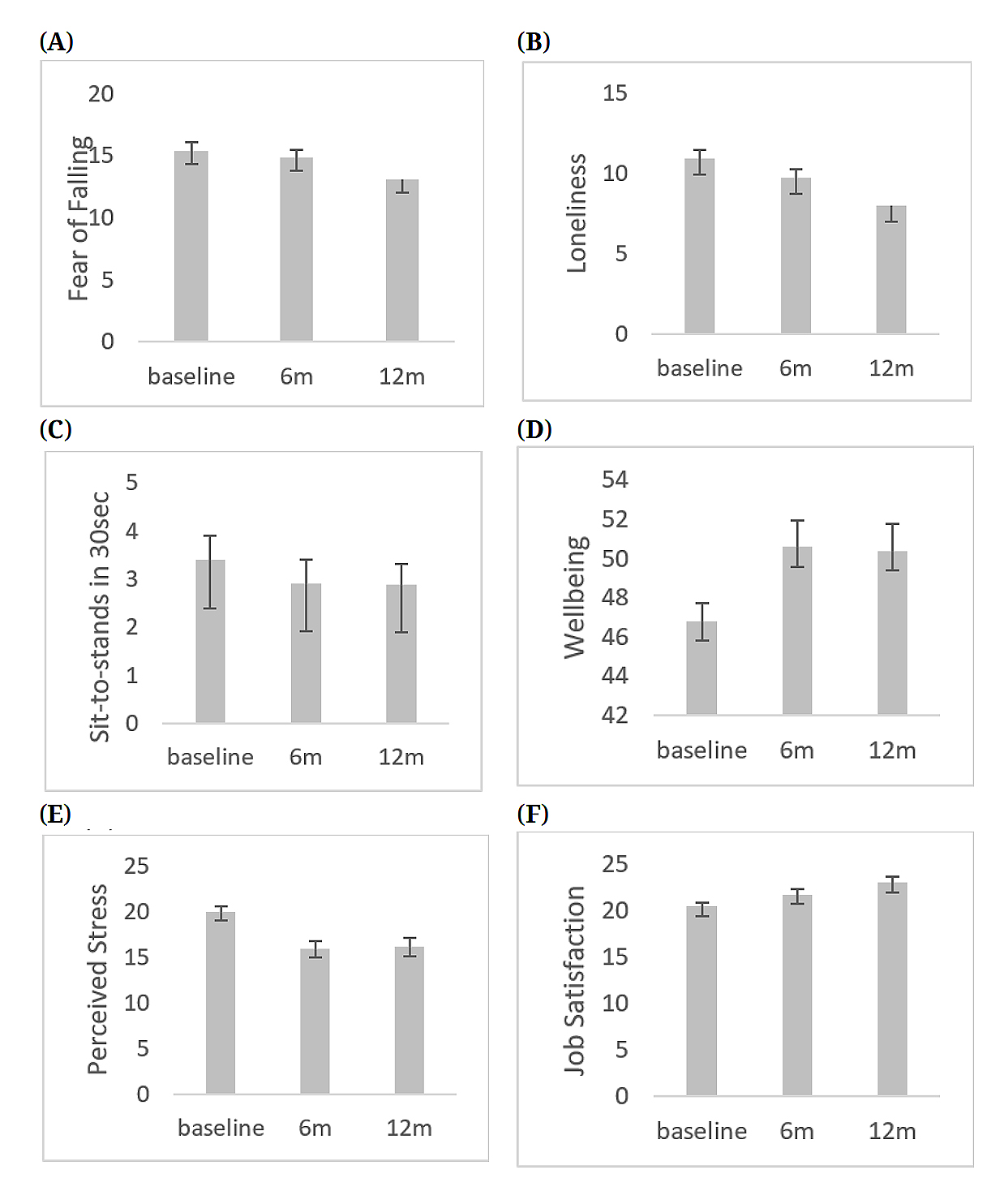 For residents, linear mixed models with adjustment for age and sex revealed a significant main effect of time for fear of falling (F(2, 84.7) = 4.05, p = 0.02), with significant differences revealed between baseline (the referent category) and 12 months but not between baseline and 6 months, such that over the year fear of falling declined 13.6% between the average at baseline to the end of the project; there was no significant effect of sex but as age increased so did fear of falling. There was a main effect of time for loneliness (F(2, 158.4) = 10.42, p < 0.001) with significant differences between baseline and 12 months, but not quite significant between baseline and 6 months, such that loneliness significantly declined 29.1% over the year; pairwise comparisons showed loneliness was also significantly lower at 12m compared to 6m (p = 0.006), but there was no significant effect of age or sex. There was no overall effect of time for sit-to-stands (F(2, 102.7) = 0.49, p = 0.62) or between baseline and either 6 or 12 months. Analysis of the participants (n = 15) who provided data on sit-to-stands at both the mid-point and final survey showed that these increased by 29%. Coefficients are shown in Table 2 and effects are displayed in Figure 2. There was no significant effect of sex on sit-to-stands but as age increased, sit-to-stands number significantly decreased.