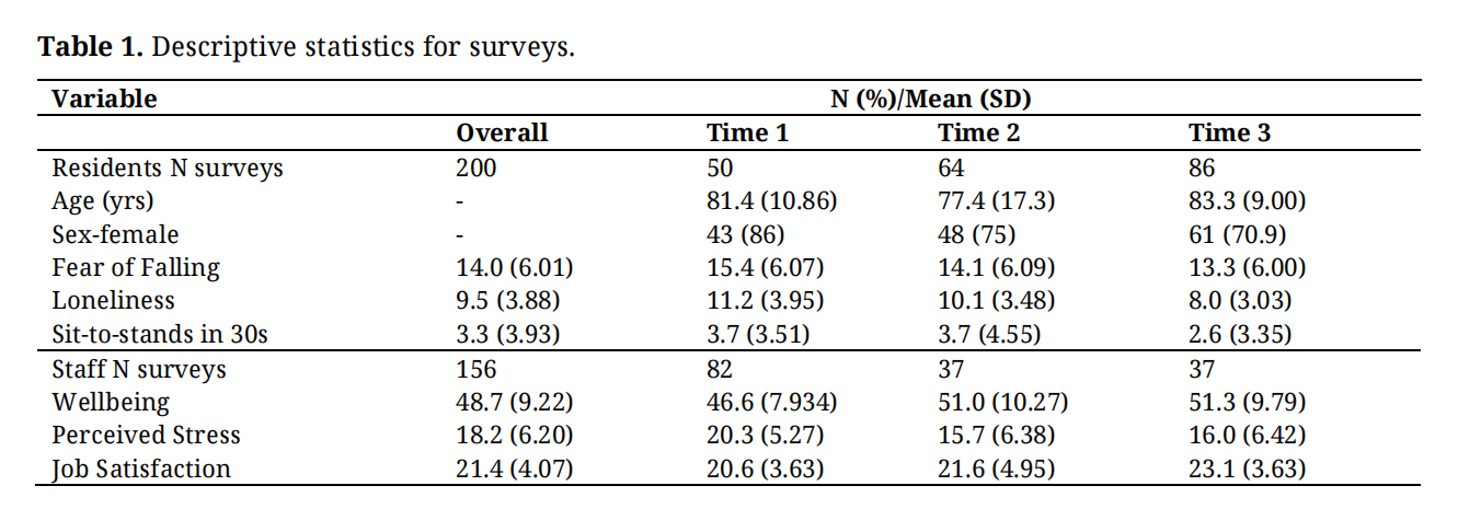 LimitationsGiven this was a small-scale evaluation using secondary data rather than intervention research, there are several limitations which should be considered when drawing conclusions about the effects. First, it was not possible to implement a rigorous repeated-measures design, and the project was not funded as research or to include researcher support for targeted recruitment data collection, so it depended on regular email reminders and online check-in meetings from danceSing to stimulate completion of the surveys. This introduces potential sampling bias and resulted in considerable missing data, including missing repeated measures, as well as relatively low response rates to the surveys although we are unable to directly measure this without knowing the number of residents per home involved, thus analyses to examine overall trends was selected rather than repeated measures. However, the findings reflect what we have demonstrated previously in our smaller scale studies and qualitative data which gives confidence to the present findings in this larger sample.