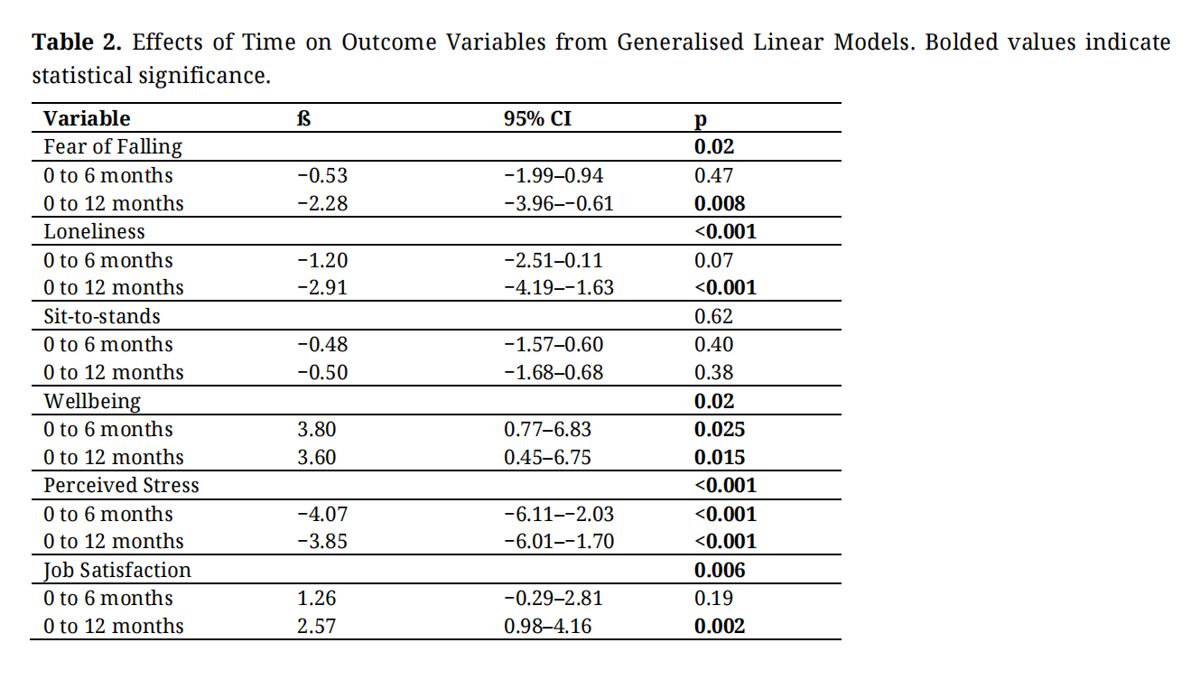 These findings are broadly in line with those of our previous small-scale research studies which showed positive effects for residents’ loneliness [18,19], and fear of falling [25], but not physical function across 12-weeks of use of the programme. This also corresponded with the mixed evidence for the effectiveness for digital interventions for increasing physical activity and improving physical function with the main positive effects being for neuropsychiatric symptoms such as depression [16].