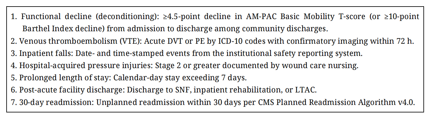 Hospitalization frequently precipitates immobility [1–3], which initiates a cascade of adverse outcomes. Prolonged bed rest and reduced mobility contribute to functional decline (deconditioning) [4–6], venous thromboembolism [7–9], falls [10–12], and pressure injuries [13–15]. Among older inpatients, low mobility during hospitalization is common—affecting 30–50% of patients depending on definitions used [1,4,16]—and is independently associated with functional decline, new institutionalization, and mortality after adjustment for illness severity and baseline function [4,17,18]. A meta-analysis of hospital-associated disability estimates that approximately 30% of older adults experience decline in one or more activities of daily living during acute hospitalization, with immobility identified as a key modifiable mediator [6].