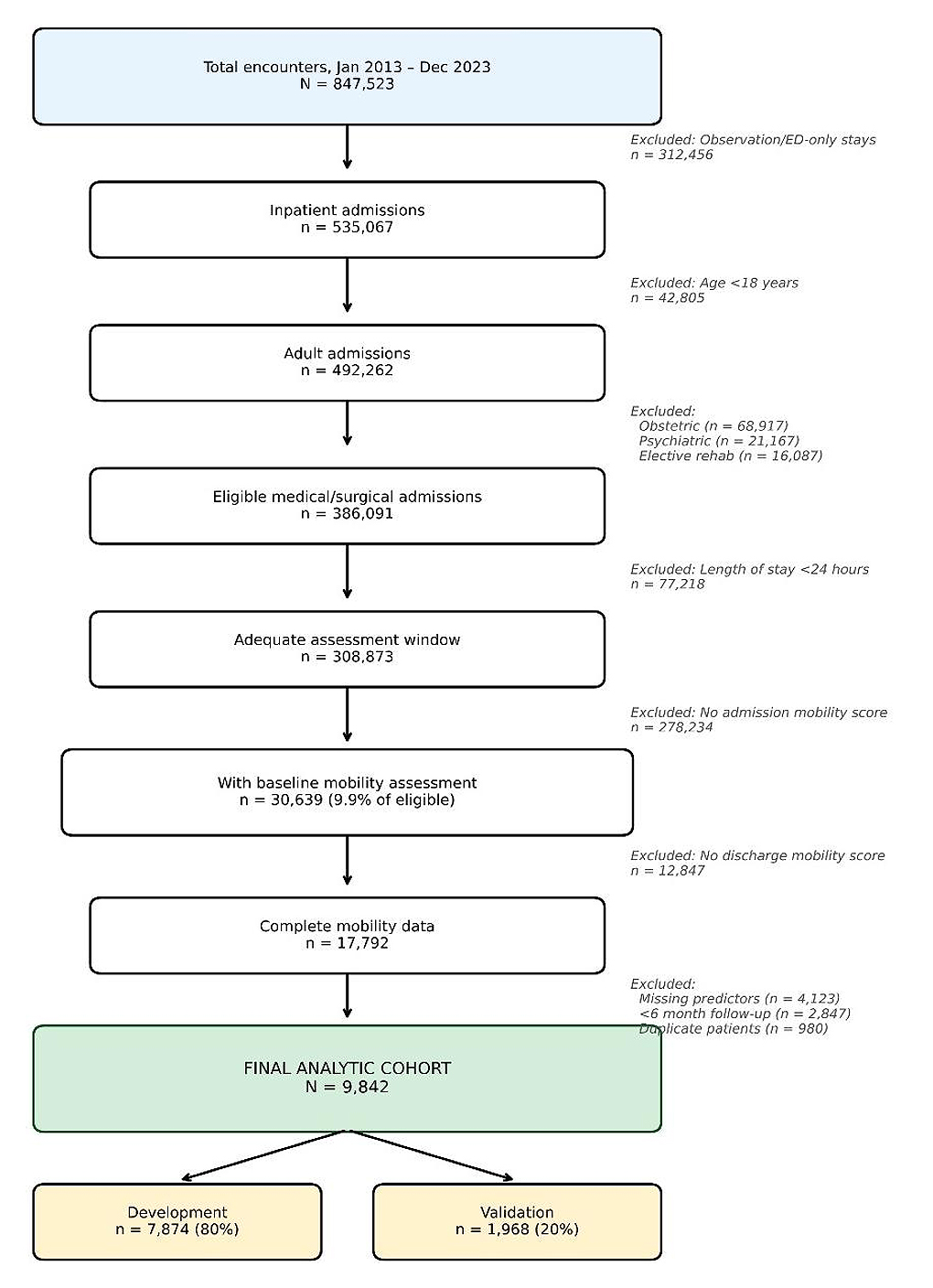 Cohort ConstructionFigure 1 displays the cohort derivation. From 847,523 total encounters during the study period, we sequentially excluded observation and emergency department-only stays (n = 312,456), patients aged < 18 years (n = 42,805), obstetric admissions (n = 68,917), psychiatric admissions (n = 21,167), elective rehabilitation admissions (n = 16,087), stays < 24 h precluding mobility assessment (n = 77,218), admissions lacking baseline mobility documentation within 24 h (n = 278,234), admissions lacking discharge mobility assessment (n = 12,847), records missing > 20% of key predictors (n = 4123), patients with <6 months post-discharge follow-up (n = 2847), and duplicate patients (n = 980, one randomly selected admission retained per patient).