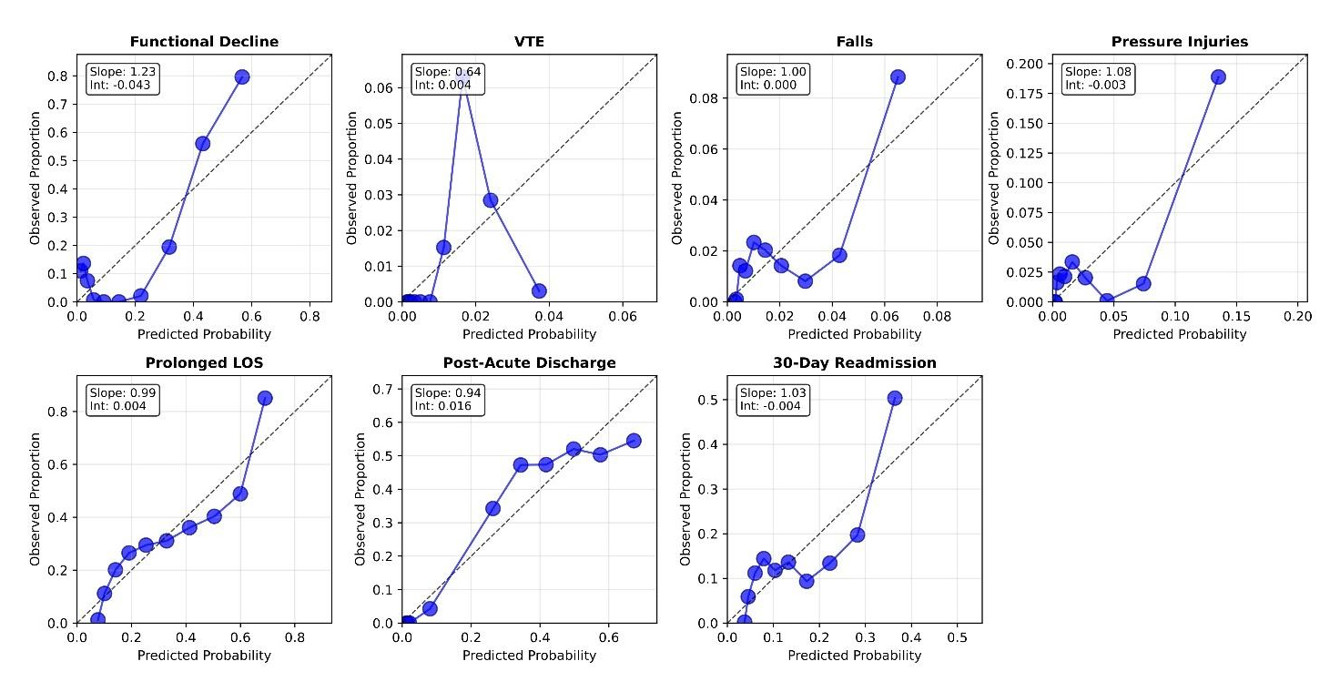CalibrationRecalibrated predictions showed excellent calibration (Figure 2; Table S5). Calibration slopes ranged from 0.96 to 1.01; intercepts ranged from −0.19 to +0.03. Mean predicted probabilities matched observed event rates for all outcomes (maximum absolute difference 0.001). Brier scores ranged from 0.011 (VTE) to 0.180 (prolonged LOS), all substantially better than null models.