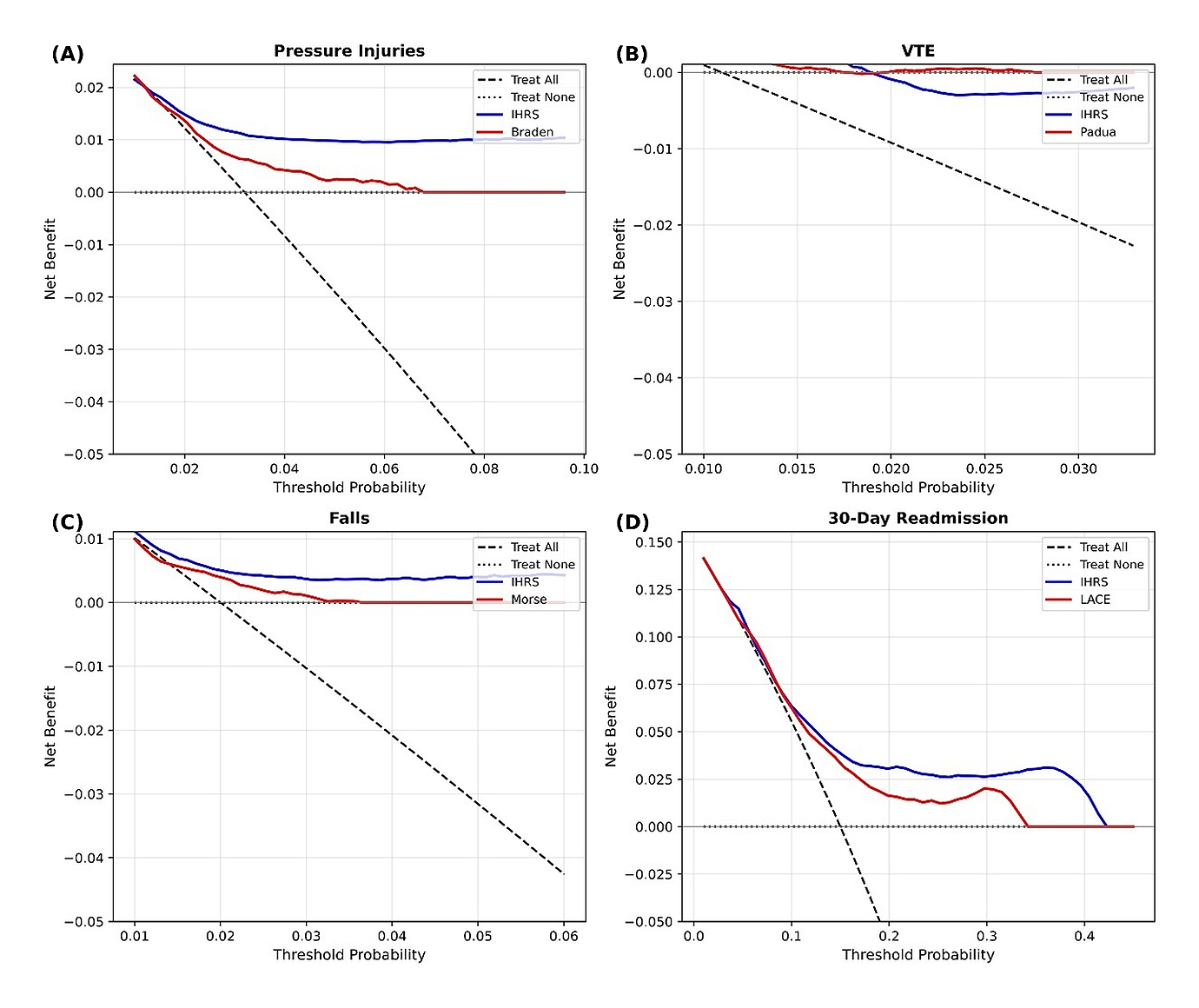 Decision Curve AnalysisDecision curve analysis demonstrated that IHRS provided greater net benefit than comparator instruments across clinically relevant threshold ranges (Figure 3). For pressure injuries, IHRS showed net benefit superior to the Braden Scale across thresholds from 1.5% to 10%. For VTE, IHRS outperformed the Padua Score at thresholds between 0.5% and 2%. Net benefit advantages were consistent for falls (vs. Morse) and readmission (vs. LACE).