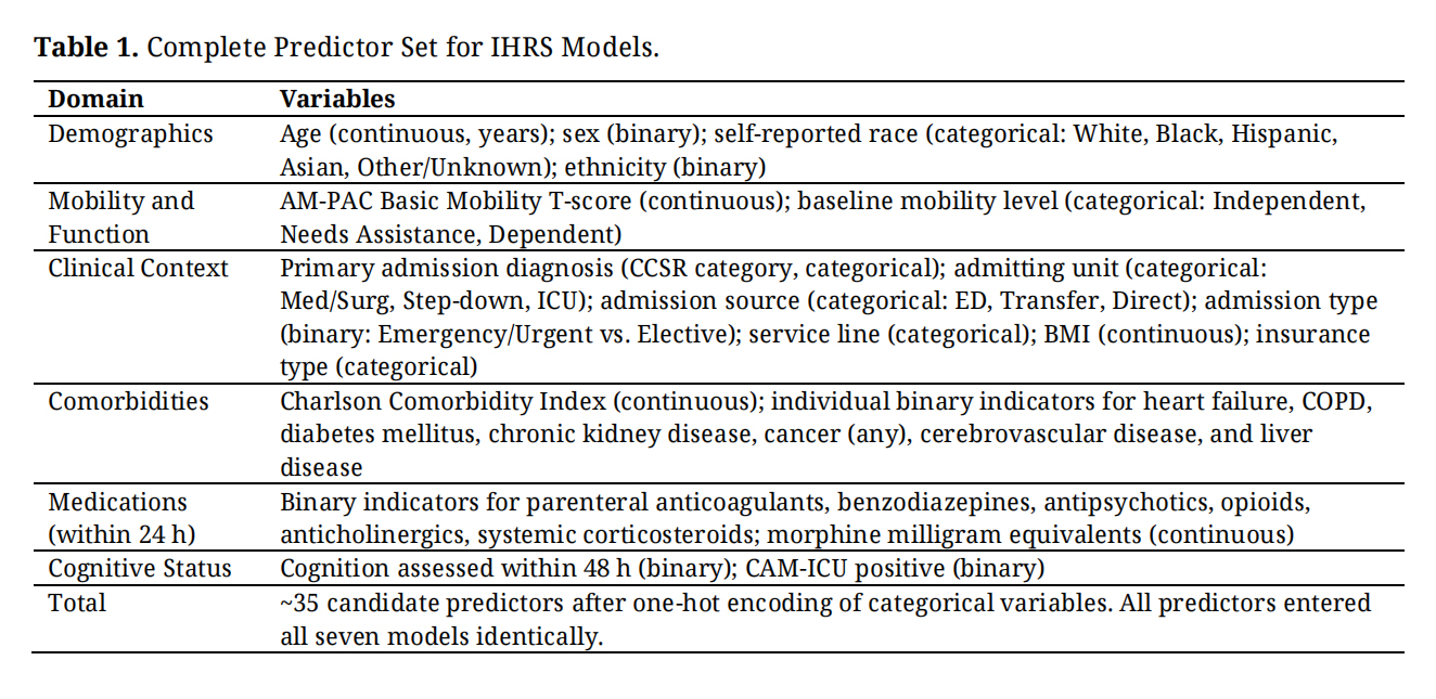 Future DirectionsExternal validation in geographically diverse populations is the essential next step. Prospective implementation studies should evaluate whether IHRS-guided interventions reduce immobility-associated harms. Investigation of patient-facing applications for shared goal-setting merits exploration.