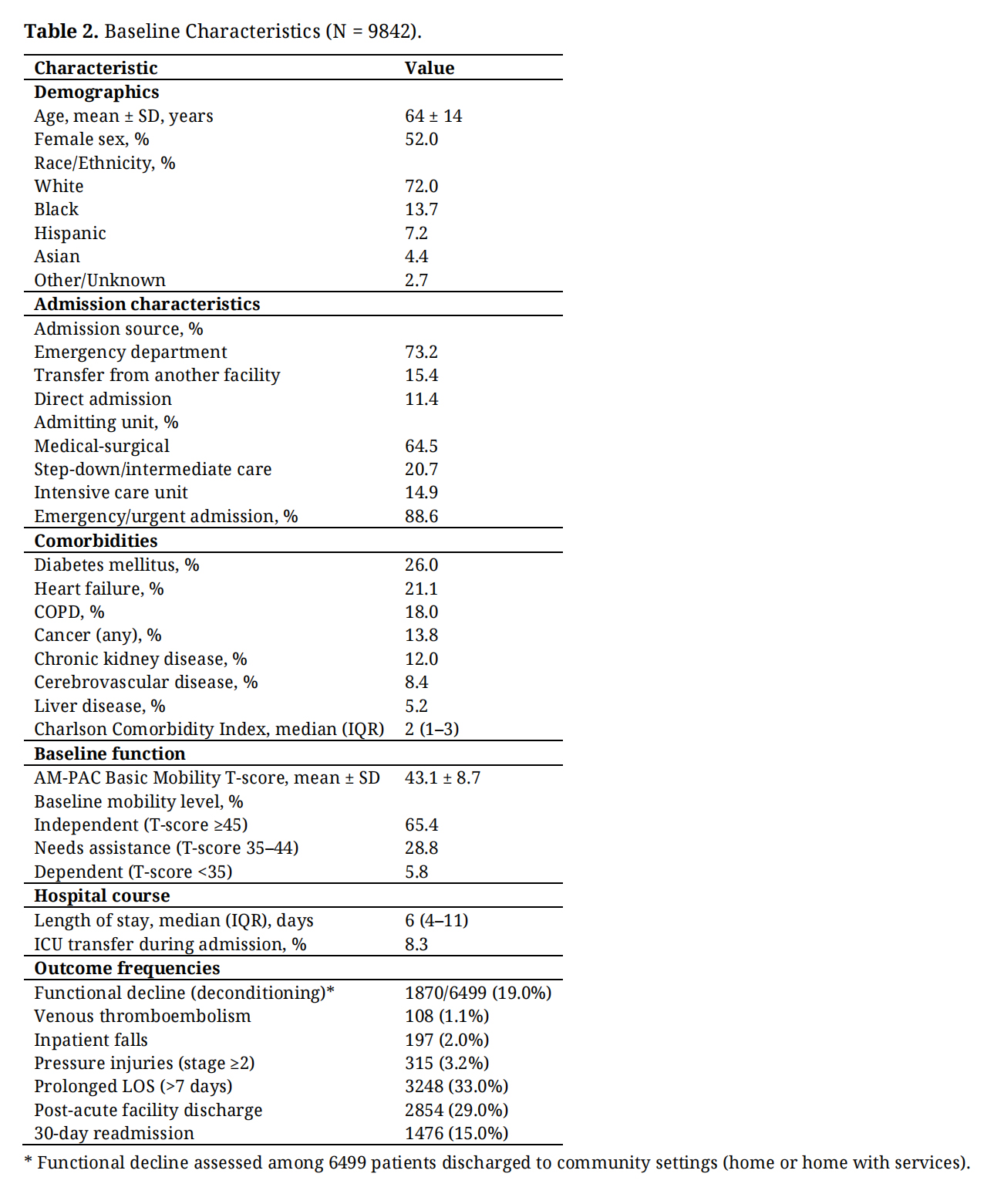 Mobility and Function: AM-PAC “6-Clicks” Basic Mobility T-score, a standardized measure (population mean = 50, SD = 10) documented by physical therapy, occupational therapy, or nursing within 24 h of admission [38]. When AM-PAC was unavailable (n = 832, 8.5%), Barthel Index scores were mapped to equivalent T-scores using published crosswalk algorithms [39]. Baseline mobility was categorized as “Independent” (T-score ≥ 45), “Needs Assistance” (T-score 35–44), or “Dependent” (T-score < 35).