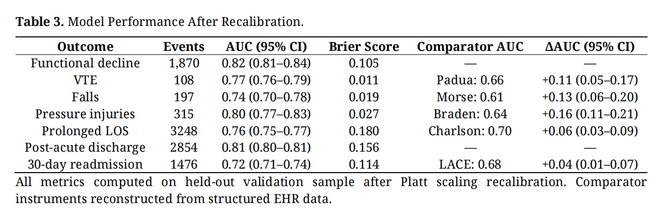 LimitationsSeveral limitations merit consideration. First, this represents single-center development and internal validation. External validation across health systems with different populations, EHR platforms, and documentation practices is essential before broader adoption. Second, the cohort was restricted to patients with documented baseline and discharge mobility assessments—approximately 10% of otherwise eligible admissions. This reflects current clinical reality where standardized mobility measurement remains inconsistent; performance in unselected admissions without mobility documentation is unknown. Third, comparator instruments were reconstructed retrospectively from EHR data rather than prospectively documented, potentially disadvantaging these tools relative to real-world use. Fourth, the temporal validation period (2020–2023) included COVID-19–related practice changes; generalizability to non-pandemic settings requires confirmation. Fifth, the model predicts risk but does not specify interventions—demonstrating that IHRS-guided protocols reduce harm requires prospective implementation studies. Sixth, model performance for deconditioning was notably stronger in older adults (≥65 years); clinical implementation should consider that predictions may be less reliable in younger patients.