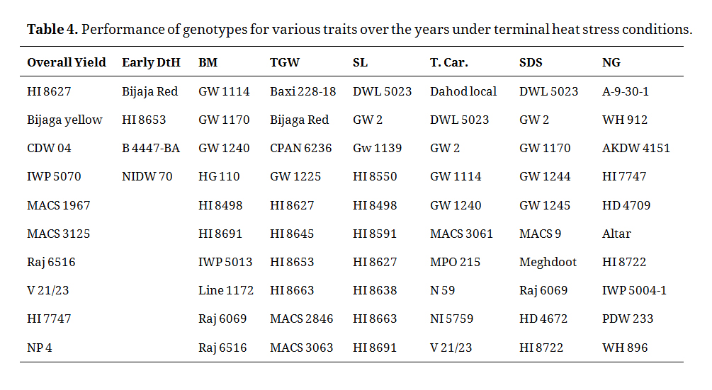 The following supplementary materials are available online at https://doi.org/10.20900/cbgg20230004. Supplementary Table S1: List of genotypes used in the experiment. Supplementary Table S2: Mean value of selected traits based on BLUEs of genotypes 2014–2017. Supplementary Table S3: Analysis of variance of principle components of biplot genotype and location of the traits across three cropping seasons under heat stress conditions. Supplementary Table S4: Performance of genotypes for adaptability, stability and both genotypic adaptability and stability for all the selected traits under terminal heat stress conditions. Supplementary Figure S1: The biplot based on the correlation data for grain yield with other yield contributing traits. It explained 69.74% of the total G + GE where PC1 and PC2 accounted for 42.36% and 27.38% of variance respectively.