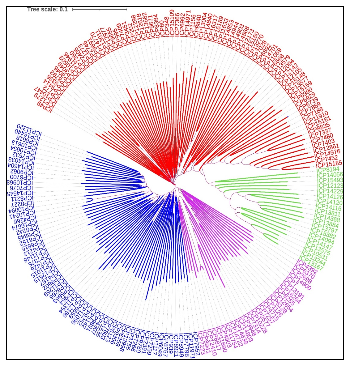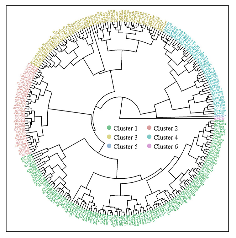 The cluster analysis of 185 pigeonpea accessions based on SNP markers revealed 4 different clusters (Figure 3). The clusters were numbered based on the highest genotypes within them. Cluster I, with red color, comprised of 76 genotypes followed by cluster II (blue) with 63 genotypes, cluster III (pink) with 27 genotypes and cluster IV (green) with 19 genotypes. This indicates that there exist substantial genetic differences among genotypes, further indicating potential evolutionary divergence.
