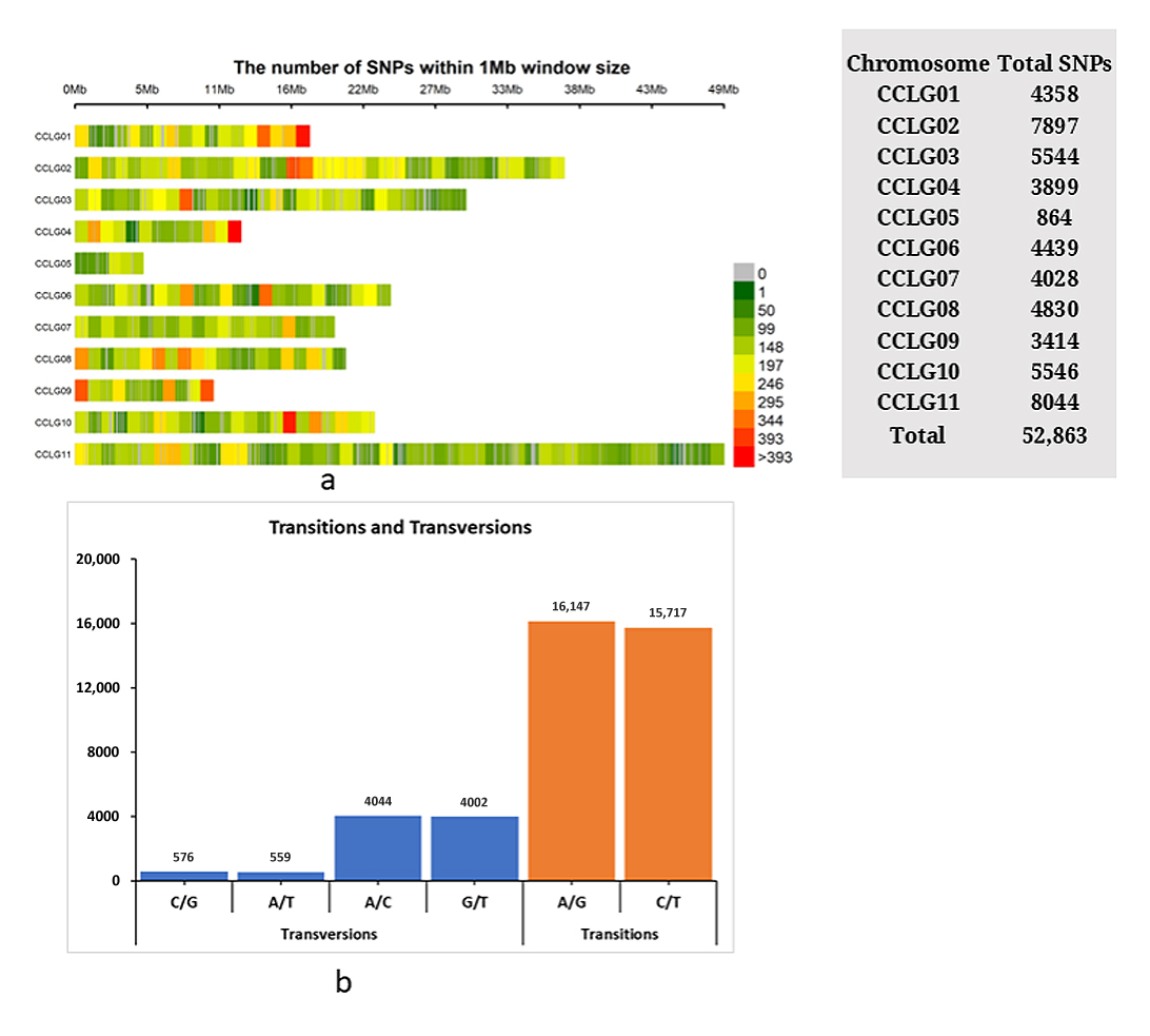 Figure 2. (a) The SNP density plot across the 11 chromosomes of pigeonpea representing number of SNPs within 1 Mb window size. The horizontal axis represents the chromosome length in Mb. Different colors correspond to SNP density. (b) Frequency of transition and transversion mutations across the pigeonpea genome.