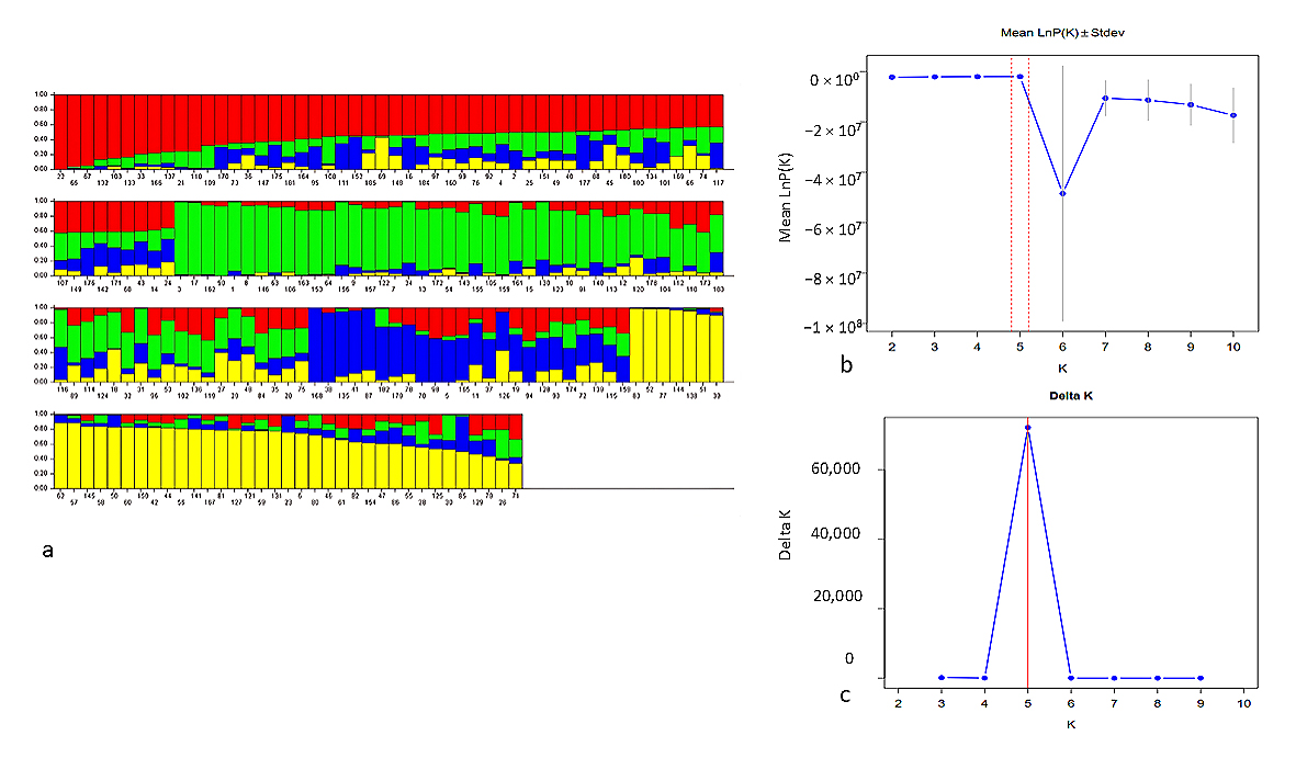 Figure 4. (a) SNP based population structure of the 185 pigeonpea accessions. (b) Mean posterior probability and standard deviation across K values and (c) Delta K plot showing the optimal number of genetic clusters.
