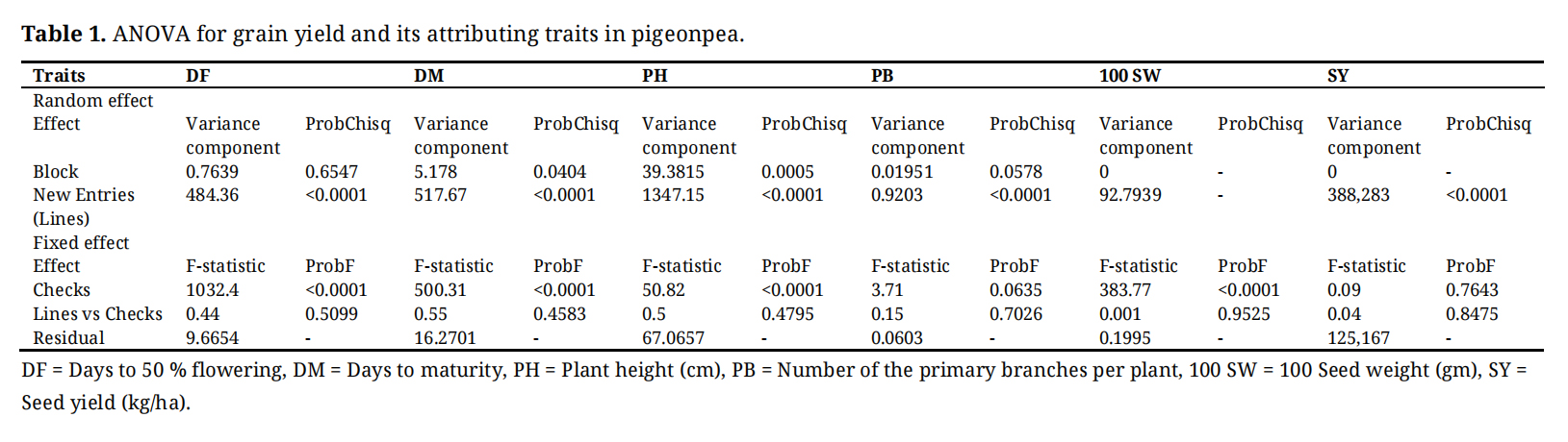 Table 1. ANOVA for grain yield and its attributing traits in pigeonpea.