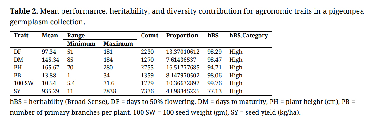 Table 2. Mean performance, heritability, and diversity contribution for agronomic traits in a pigeonpea germplasm collection.