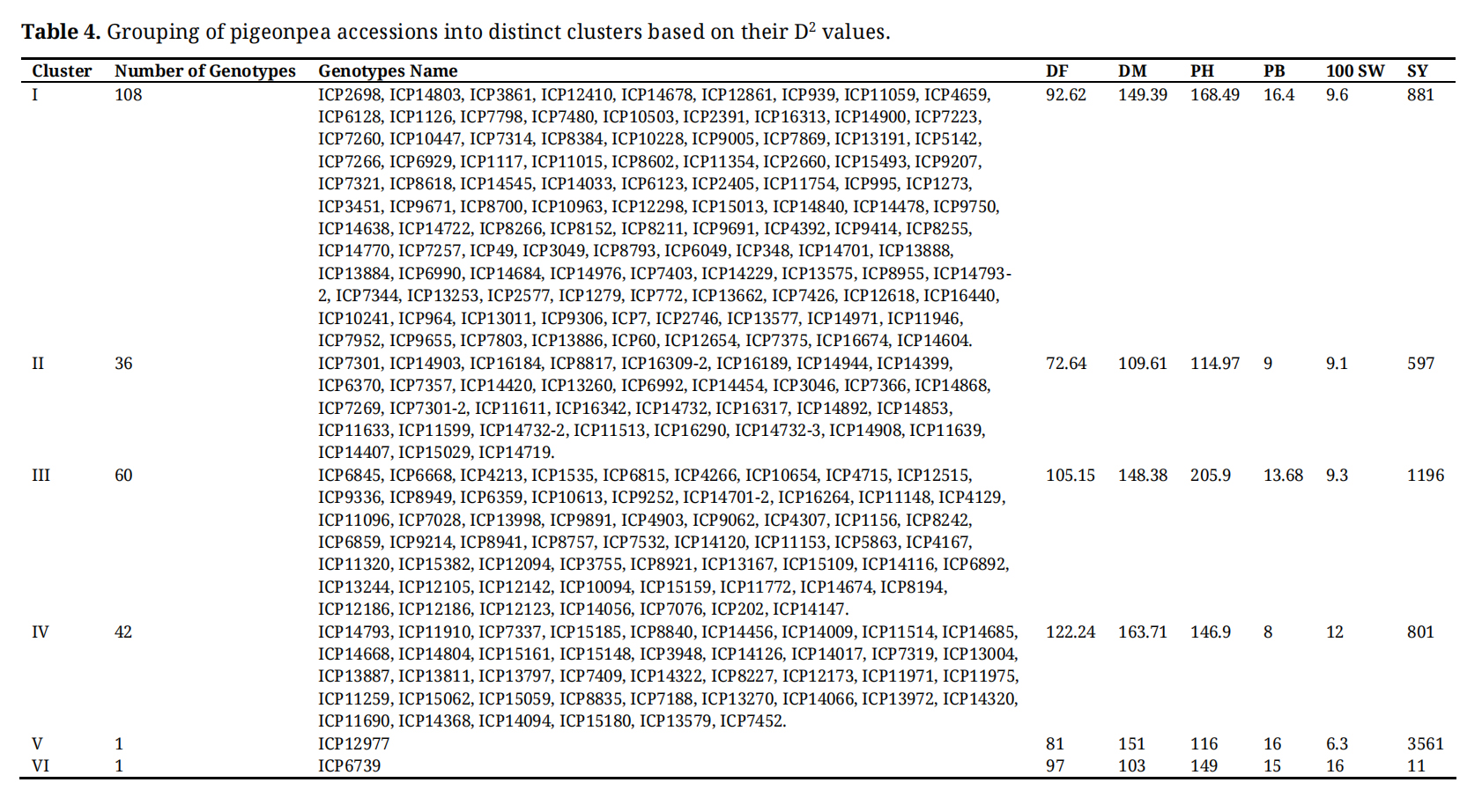 Table 4. Grouping of pigeonpea accessions into distinct clusters based on their D2 values.