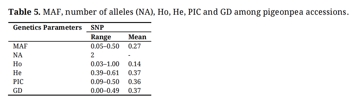 Table 5. MAF, number of alleles (NA), Ho, He, PIC and GD among pigeonpea accessions.