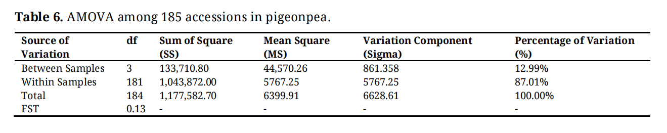 Table 6. AMOVA among 185 accessions in pigeonpea.