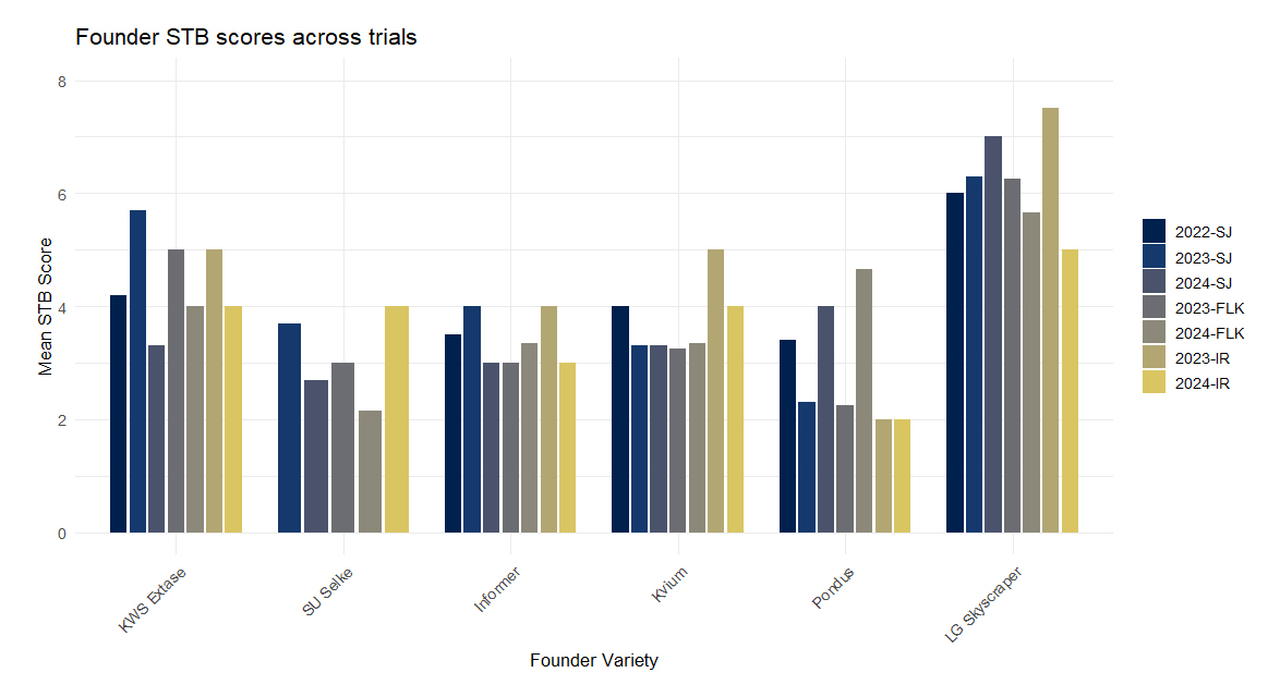 It is well established that disease levels vary between years and locations, supported for instance by data from several years of Danish national field trials (https://sortinfo.dk/). Other studies have shown that STB disease levels are highly affected by the environment [29–31].We observed some variation of founder variety STB levels across the included seasons and locations (Figure 1), with slightly higher levels identified in the Irish trials, likely due to more optimal climatic conditions for pathogen growth and establishment.