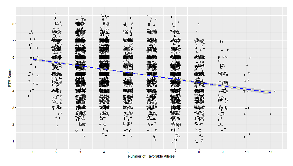For each SNP, the favorable allele was defined as the one associated with reduced STB severity in the discovery analysis.