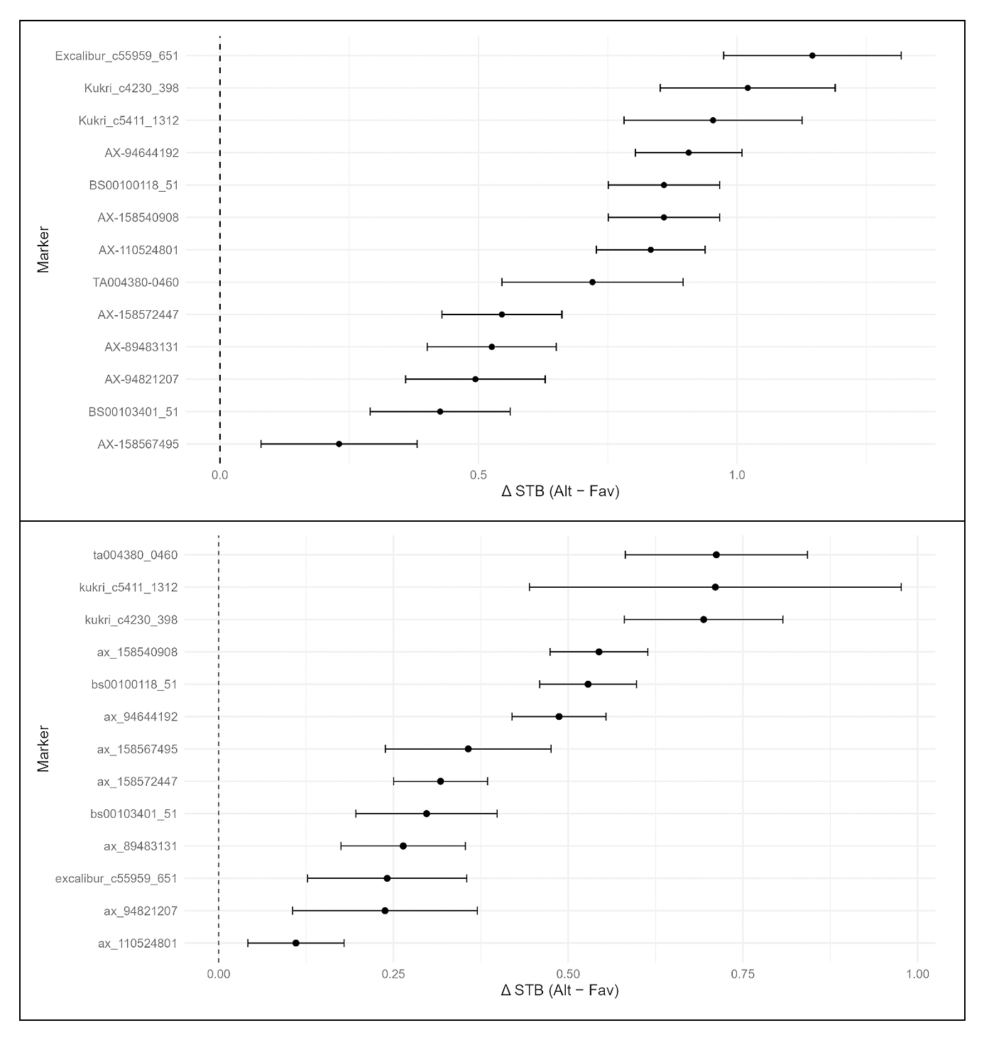 where Marker was treated as a fixed effect (favorable vs alternative allele), Year as a fixed effect to account for environmental differences, and ε as residual error. Effect sizes (Δ = Alt − Fav) were calculated per year and across years. A marker was considered validated if the favorable allele reduced STB severity consistently in direction across all years. We deliberately adopted a stringent validation criterion requiring consistent direction of effect across years to prioritize markers with robust, broadly applicable breeding value rather than environment-specific utility.