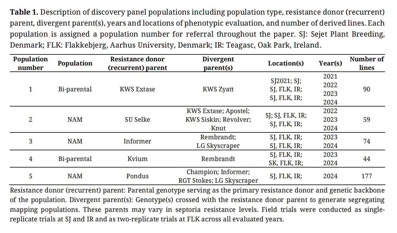 Table 1. Description of discovery panel populations including population type, resistance donor (recurrent) parent, divergent parent(s), years and locations of phenotypic evaluation, and number of derived lines. Each population is assigned a population number for referral throughout the paper. SJ: Sejet Plant Breeding, Denmark; FLK: Flakkebjerg, Aarhus University, Denmark; IR: Teagasc, Oak Park, Ireland.