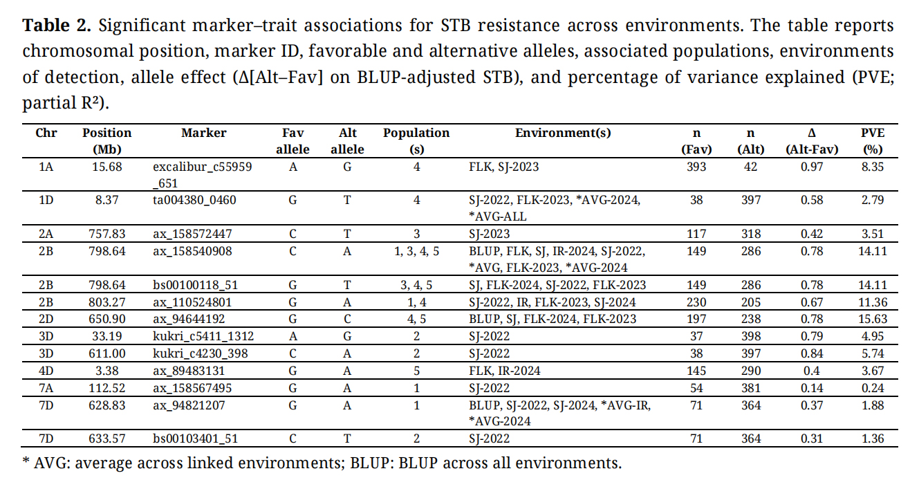 Table 2. Significant marker–trait associations for STB resistance across environments. The table reports chromosomal position, marker ID, favorable and alternative alleles, associated populations, environments of detection, allele effect (Δ[Alt–Fav] on BLUP-adjusted STB), and percentage of variance explained (PVE; partial R²).