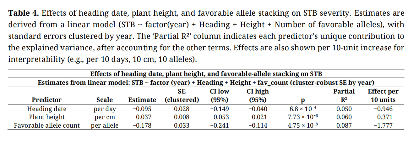 Table 4. Effects of heading date, plant height, and favorable allele stacking on STB severity. Estimates are derived from a linear model (STB ~ factor(year) + Heading + Height + Number of favorable alleles), with standard errors clustered by year. The ‘Partial R²’ column indicates each predictor’s unique contribution to the explained variance, after accounting for the other terms. Effects are also shown per 10-unit increase for interpretability (e.g., per 10 days, 10 cm, 10 alleles).