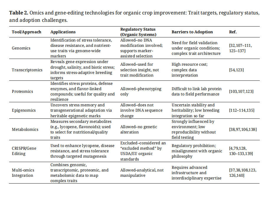 Table 2. Omics and gene-editing technologies for organic crop improvement: Trait targets, regulatory status, and adoption challenges.