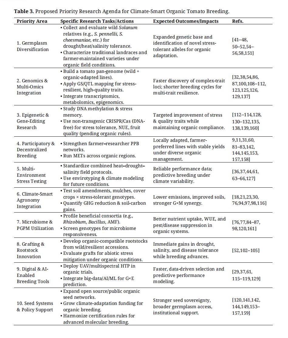 Taken together, the emerging trend in climate-smart breeding for organic tomatoes is a shift from variety development as a standalone activity to an integrated, systems-oriented pipeline: organic-compliant breeding (MAS/genomic selection, on-farm and participatory selection), explicit targeting of stress-resilience and microbial responsiveness, rapid physiological gains through grafting, and tight coupling with agroecological practices that build soil function and water resilience[11,24,30,60,80,83,84,95,103,105,110]. This integrated approach aligns with CSA goals while remaining consistent with organic standards and values, positioning organic tomato systems to remain productive and regenerative under increasing climatic stress [17,23,24,60,76,78] (Figure 1).