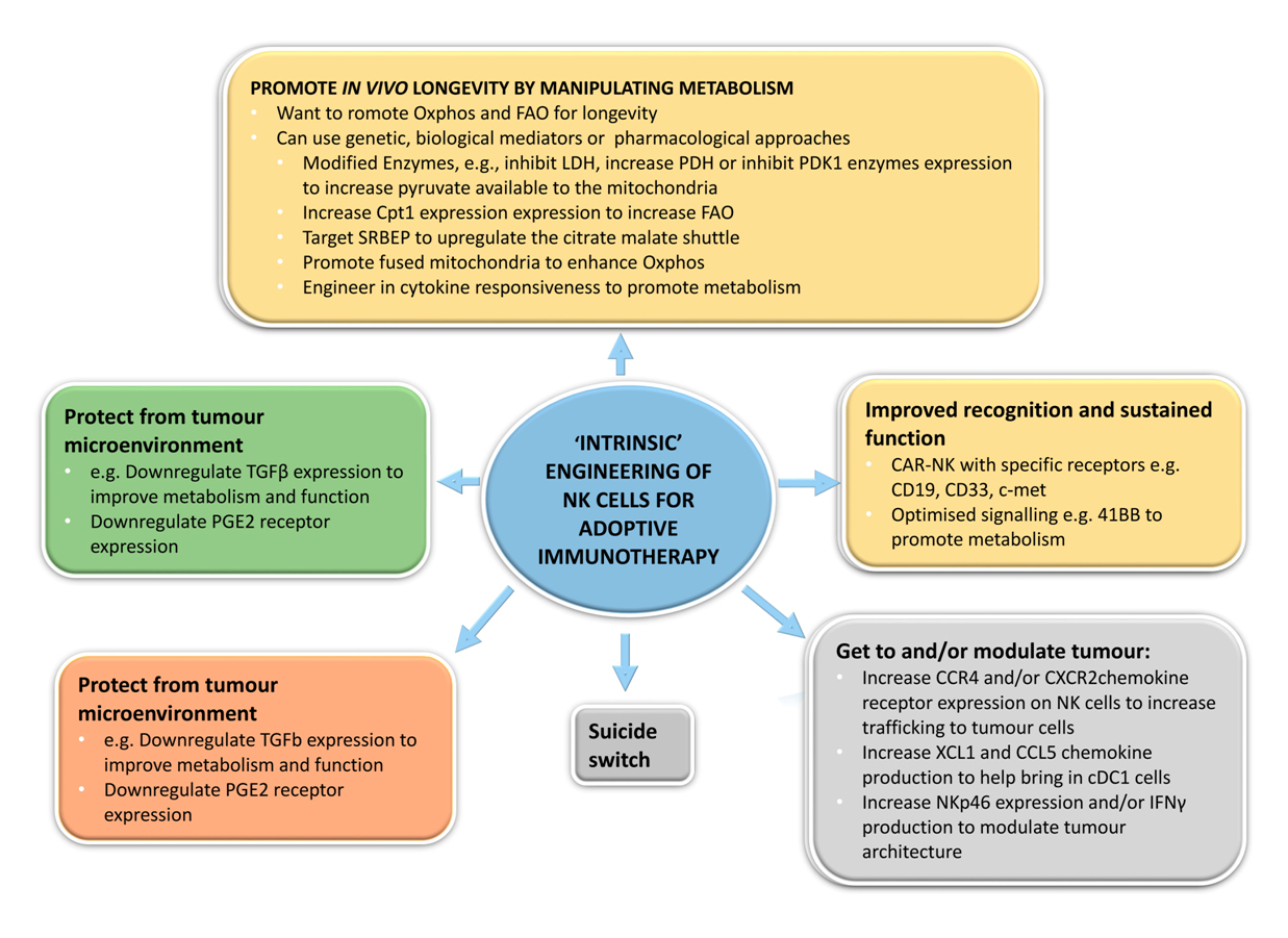 Other indirect mechanisms include engineering in cytokines that promote NK cell survival and metabolism and proof of principle for this approach (using IL15) has already been demonstrated in a CAR-NK preclinical model [44]. However, more work on the basic metabolism within NK cells and the mechanisms of regulation are required to make informed decisions. Indeed, it is likely that NK cells from different sources and environments will have different metabolic requirements that will have to be considered.
