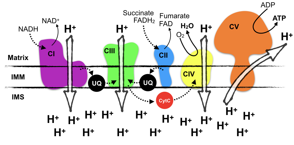 Figure 1. The mitochondrial Electron Transport Chain (ETC) comprises complexes I to V (CI to CV) as well as other accessory proteins, such as Ubiquinone (UQ) and Cytochrome C (CytC). These proteins work together to oxidize reduced compounds such as NADH, FADH2 or Succinate and finally transfer electrons to O2, thereby generating water and creating an electrochemical gradient of protons used by Complex V to synthesize ATP (oxidative phosphorylation, OXPHOS). Dotted lines represent the flow of electrons. IMM: inner mitochondrial membrane; IMS: inter-membrane space.