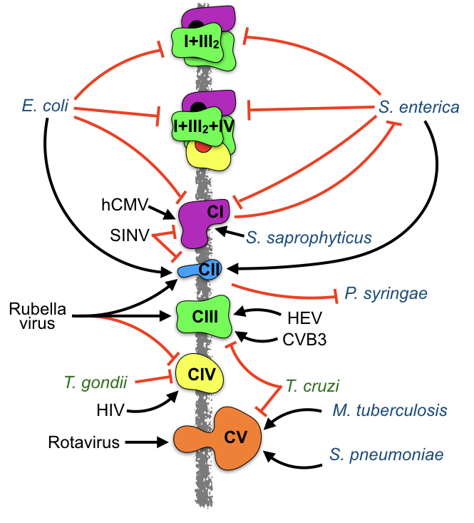 Mitochondrial ETC complexes have been thus proposed as therapeutic targets for human diseases such as autism, cancer or viral infections [64,108,109]. However, their roles regulating host responses to infection or their targeting by pathogens during infections remain largely unknown. Thus the study of ETC complexes during infection will not only bring fundamental knowledge about metabolic host-pathogen interactions, but might also determine whether mitochondrial ETC complexes can be used as targets in the host to tackle infection.