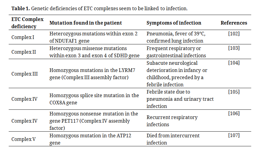 A very interesting aspect that should be addresed in the future is whether genetic deficiencies of ETC complexes, which are frequent in patients with neurodegenerative, motor and/or cognitive problems, also predispose to infection. Some case reports of patients harboring mitochondrial ETC dieseases include recurrent infections as symptoms, and some reports showed that patients initiated their neurological symtomps after suffering feaver or a well identified infection (Table 1). These clinical cases of patients with deficiencies in ETC complexes might point to a functional link between mitochondrial ETC complexes and infections [102–107].