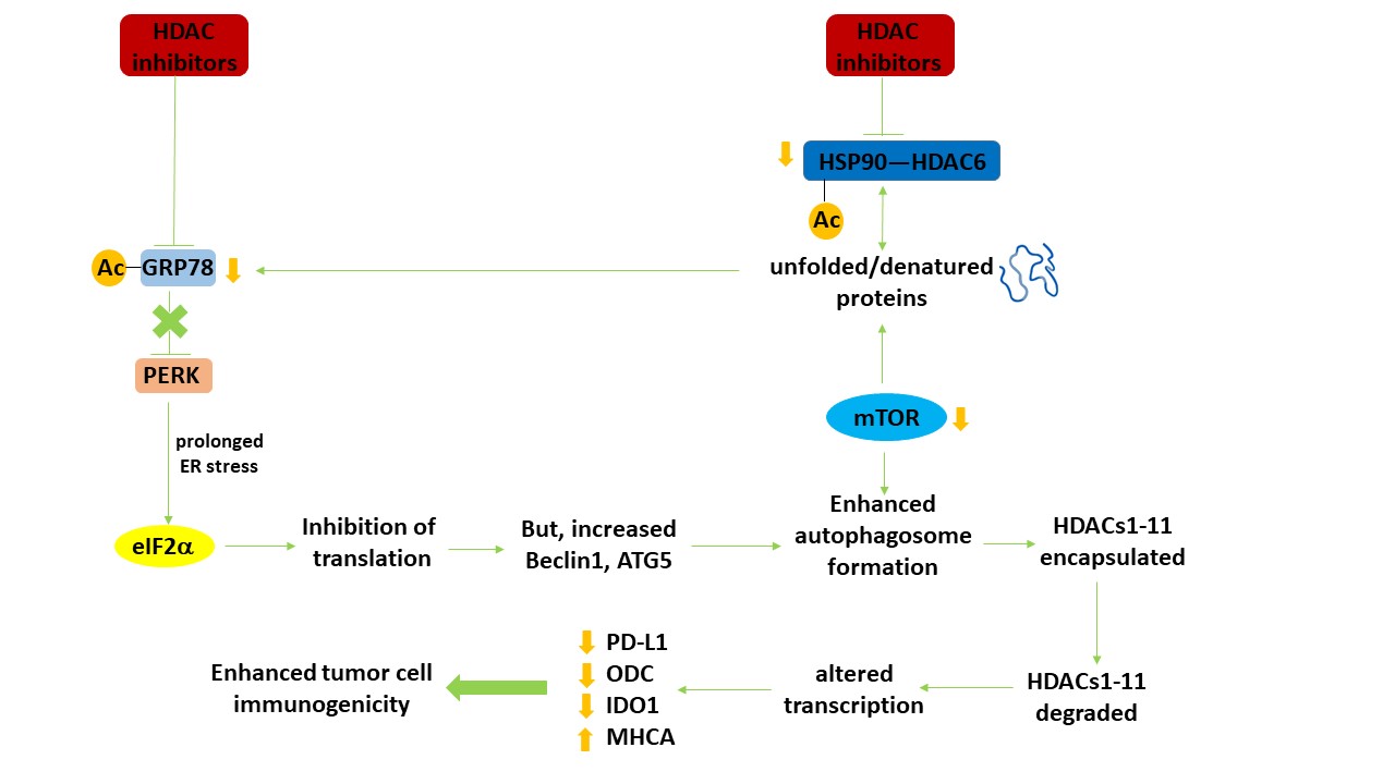 Figure 1. Autophagy regulates the expression of HDAC proteins which in turn leads to altered transcription and enhanced tumor cell immunogenicity. HDAC inhibitors increase the acetylation of multiple protein chaperones, thereby reducing chaperone function. Reduced chaperone function increases the levels of denatured proteins, including growth factor receptors and signaling intermediates, leading to inactivation of the autophagy master regulator mTOR. In parallel, because of the abundance of denatured proteins and the reduced functionality of GRP78, an endoplasmic reticulum stress response from PERK to eIF2α to reduced protein translation occurs. Reduced GRP78 function also results in activation of the IRE1 ER stress pathway which via activation of the c-Jun NH2 terminal kinase pathway can also facilitate tumor cell death. Although translation from the majority of genes is reduced, some, such as the autophagy regulatory proteins Beclin1 and ATG5 is enhanced. With the inactivation of mTOR and increased levels of Beclin1 and ATG5, autophagosome formation is enhanced. Encapsulated HDAC proteins in the autophagosome, following fusion with acidic endosomes to become autolysosomes, are degraded. Reduced expression of HDACs alters the transcription of many genes, notably that the protein levels of PD-L1, ODC and IDO-1 decline and that of Class I MHCA is enhanced. In vivo, these changes result in enhanced efficacy of checkpoint inhibitory immunotherapeutic antibodies. Adapted with permission from [16], copyright © 2019 Elsevier B.V.
