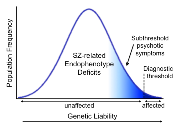 Endophenotypes are quantitative in nature and reflect a continuous distribution of trait values in the general population, consistent with polygenic theories of SZ [50–52]. Under this scenario, as detailed in Figure 1, individuals carrying non-penetrant risk variants do not diminish a linkage signal, as with an analysis of diagnosis. Indeed, SZ patients, unaffected relatives, and controls provide a range of scores and are thus informative regarding the underlying liability. Therefore, by using endophenotypes to measure the underlying liability to SZ as a quantitative trait, we gain significant power and increased resolution compared to analyses of diagnosis, which use a somewhat subjective threshold to dichotomize a continuous trait [53,54]. For a disorder like SZ, which has a prevalence of ~1% and heritability of 60–80%, the analysis of a quantitative endophenotype is expected to be approximately 100-fold more efficient than the analysis of the categorical diagnosis, which translates to a 10-fold increase in power [53]. The analysis of an endophenotype thus requires a substantially smaller sample size to achieve comparable power to an analysis of SZ diagnosis. By enriching for individuals with higher liability to SZ, who presumably carry more risk alleles, family-based designs provide a further increase in power [55].