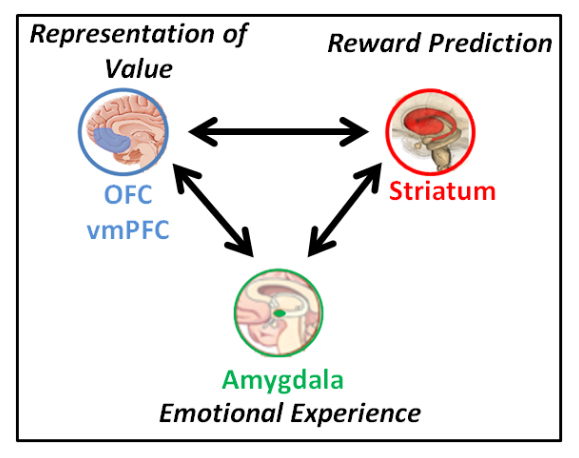 The cortical-basal ganglia circuit is critical to reward processing and decision making [20]. Two fundamental processes of this reward circuit that are relevant for this grant project are reward prediction errors (RPE) and the representation of expected value (EV) [21] (Figure 1). Dopamine projections from the ventral tegmental area to the striatum are particularly important for reward learning [20]. These neurons code RPEs which occur at the time an outcome is received. Positive RPEs are associated with a phasic increase in dopamine firing when the outcome is better than expected and are thought to reinforce associations [22]. Negative RPEs are associated with a decrease in phasic dopamine firing when the outcome is worse than expected and are thought to weaken associations. RPEs and striatal activity are thought to represent implicit reward learning (e.g., learning that is not necessarily in conscious awareness) [23–25]. EV comes into play at the time of choice when one has to compare different options in order to make a choice [26,27]. This involves the orbitofrontal cortex (OFC) and more specifically the ventromedial prefrontal cortex (vmPFC) [15,28]. The generation of EVs by prefrontal cortex is thought to represent explicit reward learning (e.g., conscious learning that is under cortical control) [25,29–32].