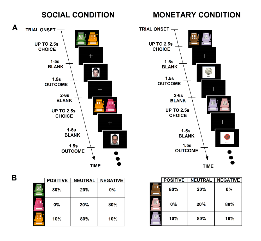The PRL paradigm we are using to assess social reward learning in schizophrenia was designed by Lin and colleagues [14,33] and has a number of appealing aspects including parallel social and monetary reward learning versions, assessment of learning to gain as well as to avoid loss, and the ability to model vmPFC function by EV and striatal function by RPE. In addition, this paradigm was successfully used in an autism study showing greater deficits to social than monetary reward learning versus controls [30]. As described in the APPROACH Section below, we modified this task for use in schizophrenia.