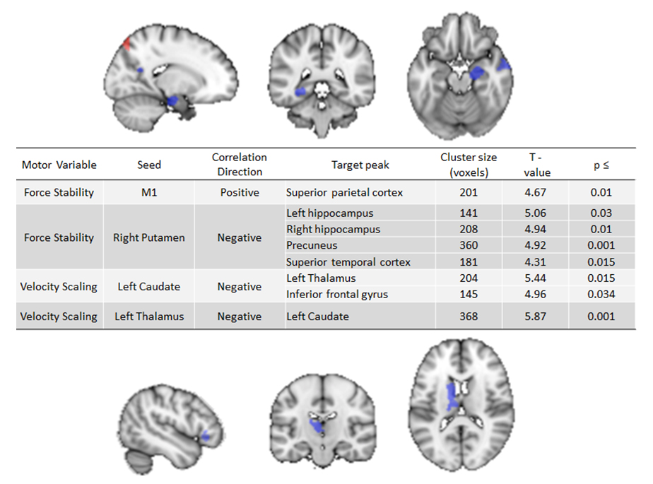 Laboratory Motor Measures and Brain Motor Networks Force variability and brain networksIn a pilot study to support the brain-motor behavior predictions in Aim 2, MPI Mittal evaluated the association between Force Variability (our laboratory indicator of PmA) and brain connectivity (seed-to-voxel resting state analysis) in 61 healthy controls. The seeds included motor network hubs, such as left/right caudate, left/right putamen, left/right thalamus, M1, and SMA. Increased Force Variability was related to increased connectivity between M1 and superior parietal cortex, and to decreased connectivity between right putamen and hippocampus, precuneus, and superior parietal cortex (see Figure 3).