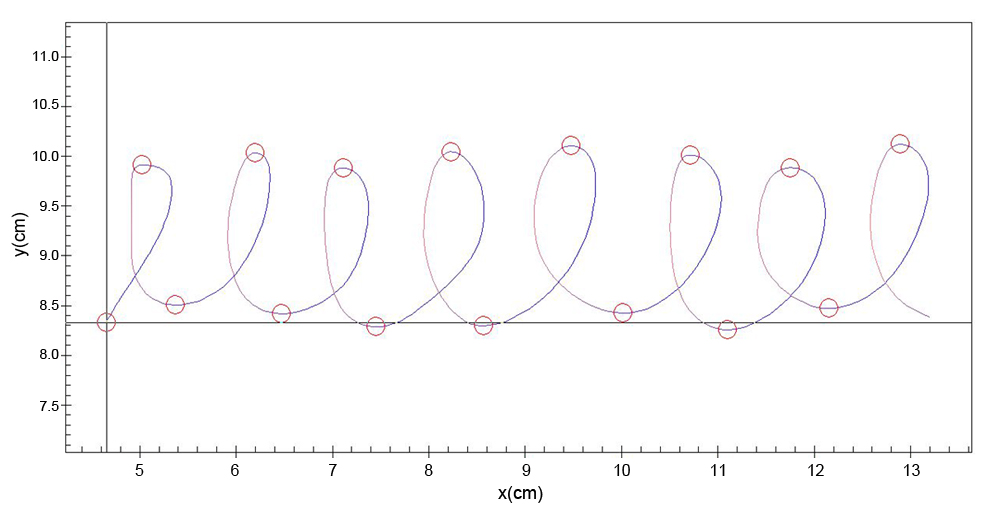 Lab measurement of PmRHandwriting samples are being obtained to compute Velocity Scaling to index PmR [76]. Lower values of Velocity Scaling reflect the slowing or inability to increase pen movement velocity across shorter and longer target distances, and have been linked to motor slowing in several clinical populations [17,18,77]. Handwriting samples are acquired using Neuroscript MovAlyzeR software (http://www.neuroscript.net), installed on a Fujitsu T901 tablet computer, and a non-inking pen. Subjects are instructed to write 8 loops continuously for 3 trials within a 2 cm or 4 cm vertical boundary, using their dominant hand (see Figure 4). Subjects are instructed to write at their normal speed. Each trial consists of 16 vertical strokes, which will be segmented and processed for target variables: peak vertical velocity and absolute size of stroke. Valid trials will include at least 10 segments. A regression with peak vertical velocity as the predicted variable will be entered, with absolute size of the stroke (to account for variance of individual stroke sizes) and condition (2 cm and 4 cm) as covariates [78].