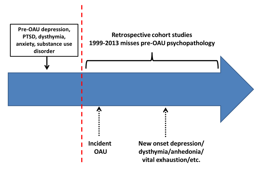 With few prospective cohort studies, the existing evidence for a bi-directional association between OAU and depression is based on retrospective medical record data or longitudinal studies without detailed measures of depression and comorbid psychiatric disorders. It is possible that OAU worsens depression symptoms or elicits recurrence of psychiatric disorders present before the start of observed medical record data. Studies of chronic OAU and NDE in medical record data lack granularity necessary to conclude that OAU leads to NDE or is better described as leading to a mix of depression, dysthymia, anhedonia and vital exhaustion.