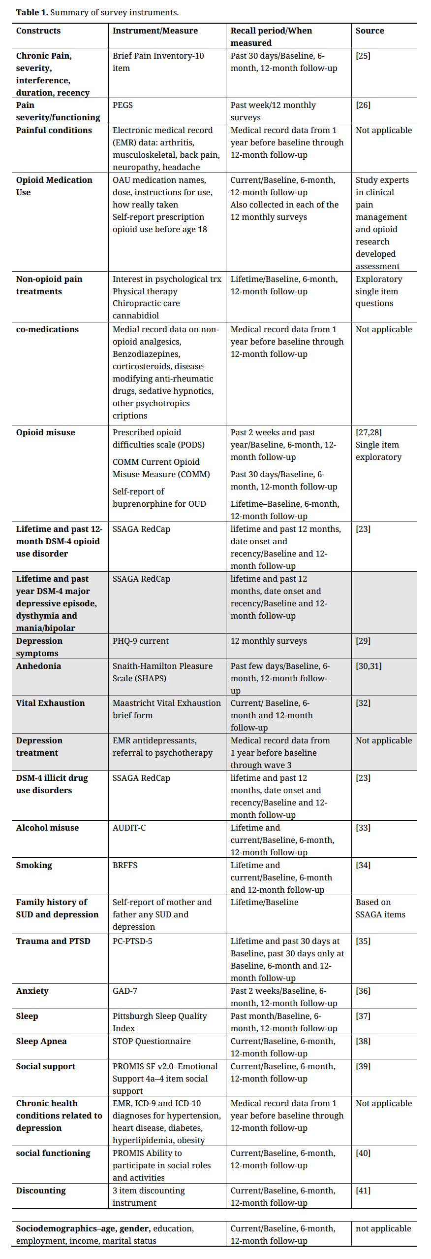All instruments used for study constructs, when they are administered, and their sources are shown in Table 1. Baseline and 12-month assessments measure the following constructs: (1) chronic pain, pain severity, pain related impaired function, pain duration and recency; opioid medication use and non-opioid pain treatments; (2) DSM criteria lifetime and past year major depressive episode, dysthymia, mania, opioid use disorder, heroin use disorder, cocaine/stimulant use disorder and marijuana use disorder. To limit subject burden, we use shorter instruments to measure lifetime and current PTSD, generalized anxiety disorder and current anhedonia and vital exhaustion, alcohol misuse, smoking and subject report on parental history of depression and substance use disorder; (3) sleep quality and sleep apnea; (4) social support and social functioning and (5) sociodemographics. The EHR data will be used to measure comorbid conditions, use of other medications and any pharmacological and non-pharmacological treatments provided for pain and other conditions. The 6-month follow-up is reduced by excluding DSM assessments. Baseline and 12-month follow-up take between 45–60 min to complete and the 6-month follow-up will take 30–40 min to complete. Each monthly assessment includes the PHQ-9, self-reported OAU and pain related impairment.
