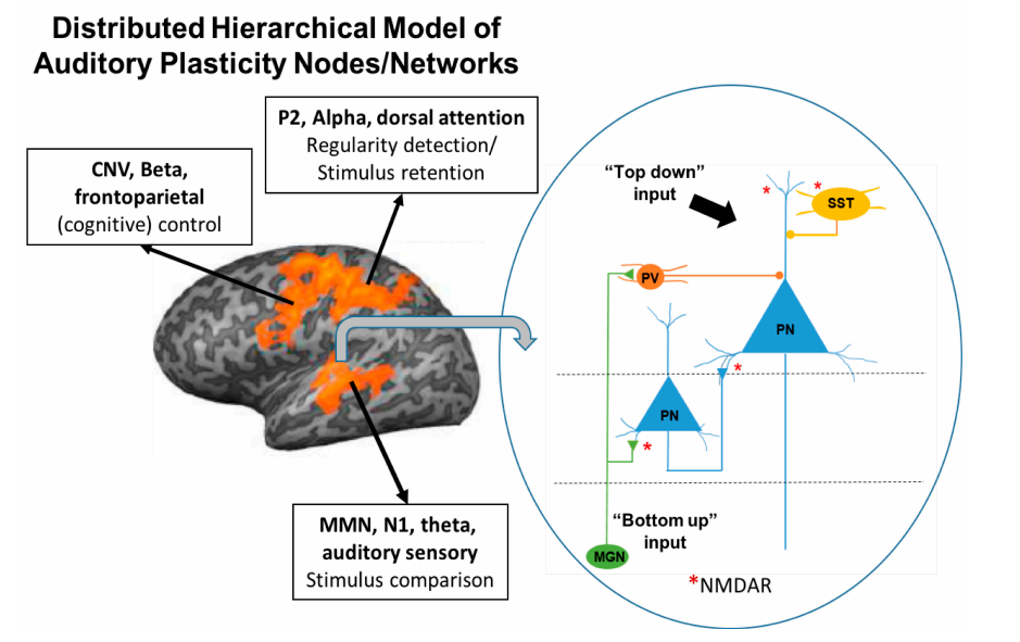 As recently reviewed [42], in addition to broader cortical NMDAR deficits, both preclinical and postmortem studies directly implicate NMDAR dysfunction in auditory plasticity deficits in schizophrenia, particularly in impaired pitch processing. Preclinical studies suggest that NMDAR blockade during auditory learning can impair brain plasticity [55,89,90] and NMDAR stimulation produces improvements in both auditory LTP and MMN in healthy rats [91], providing further preclinical support for equating MMN with cortical neuroplasticity.