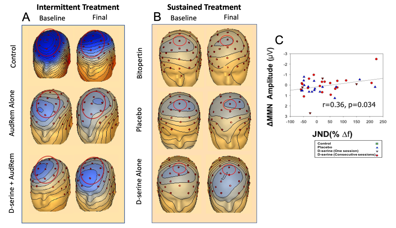 Two recently published studies support the utility of D-serine to study and enhance plasticity and AudRem, finding that both intermittent and sustained D-serine treatment modulates MMN [15,123]. The first [15] serves as the model for the design of the R61–R33 project. In this study, 21 schizophrenia patients received either D-serine 60 mg/kg or placebo with three 1× weekly sessions of AudRem program. ERO responses were recorded during the AudRem, while MMN was measured pre-post training sessions. A significant D-serine treatment effect vs placebo was seen for pitch discrimination after AudRem (behavioral plasticity), along with the EEG plasticity measures MMN (Figure 2A) and activity in the θ and β ranges. Furthermore, following just two D-serine treatments, schizophrenia outcomes for behavioral plasticity were normalized vs. controls. Consistent with prior studies [122], schizophrenia subjects receiving AudRem alone tended to show worsening in MMN. A relationship between improvements in plasticity and MMN was seen (r = −0.34, p = 0.034, Figure 2C), while changes in θ also correlated significantly with plasticity improvements (r = −0.39, p = 0.002).